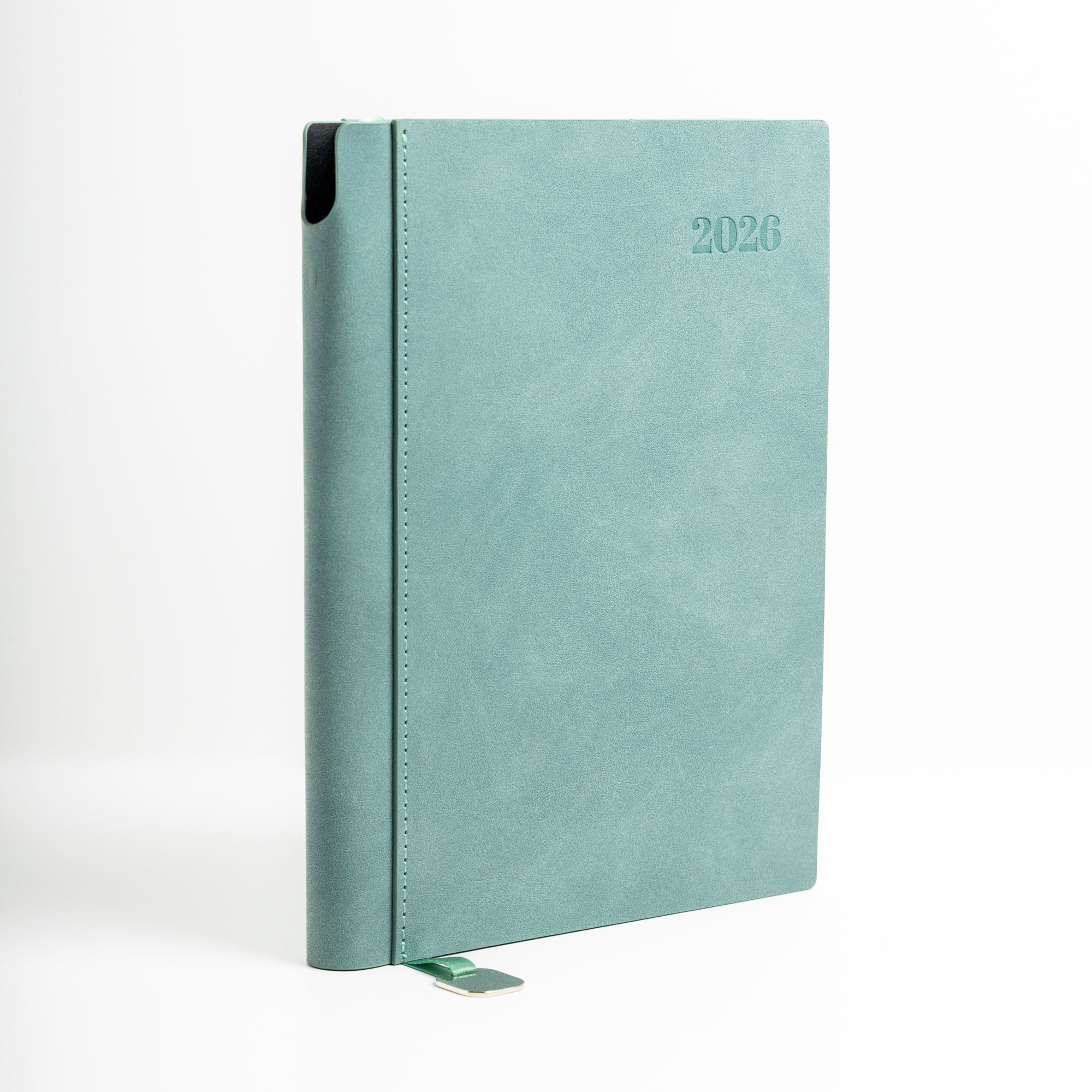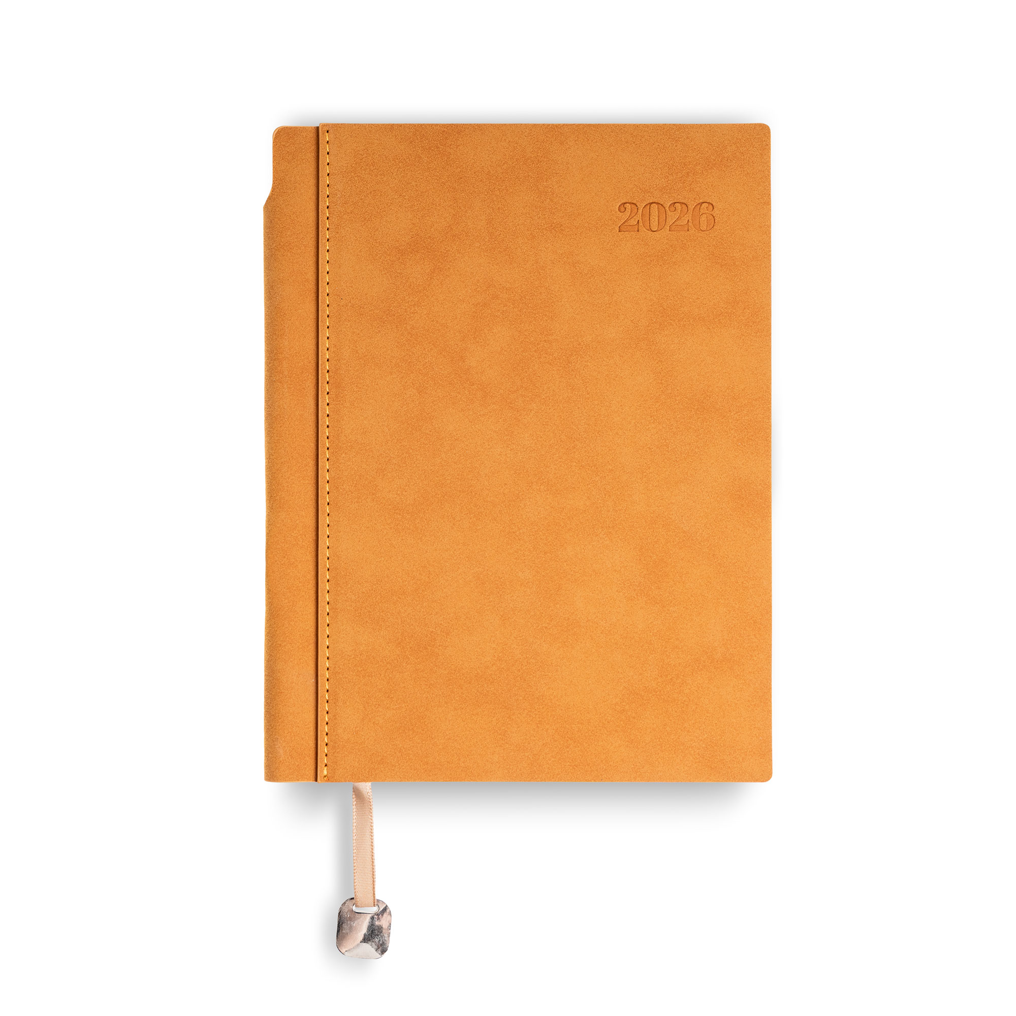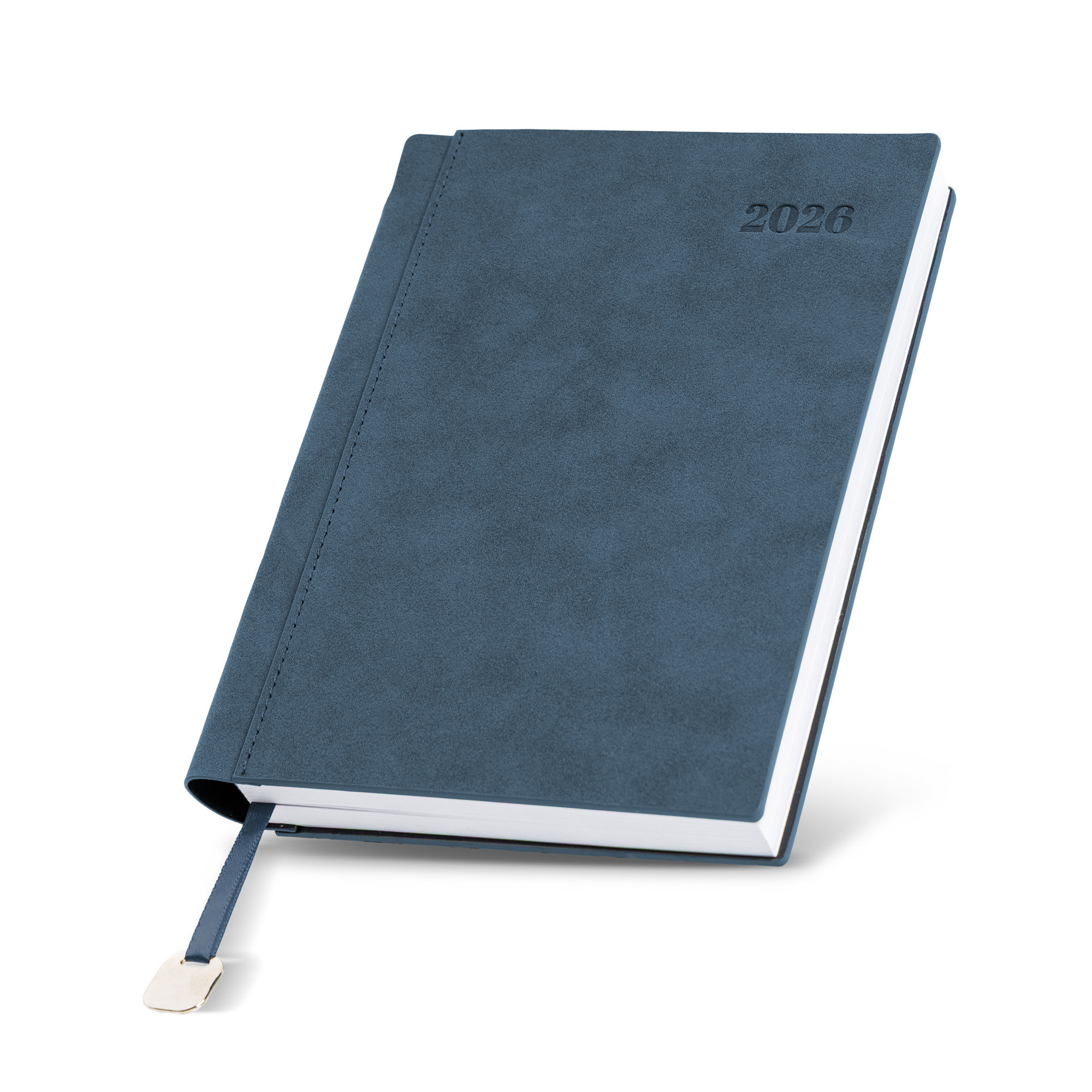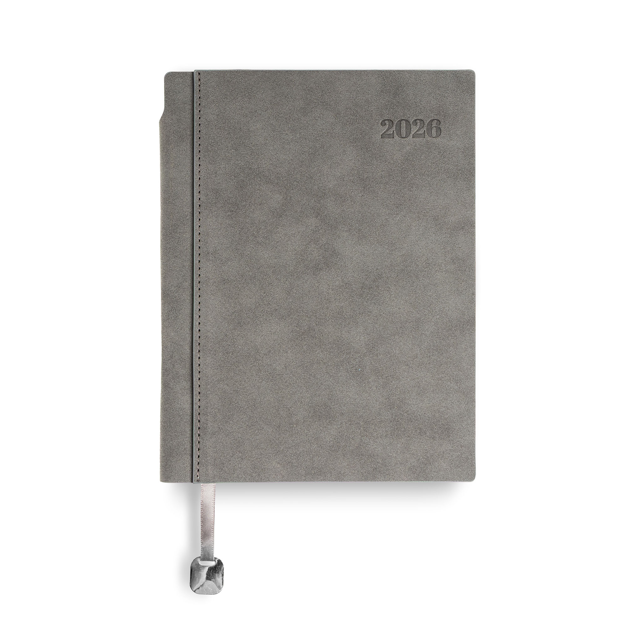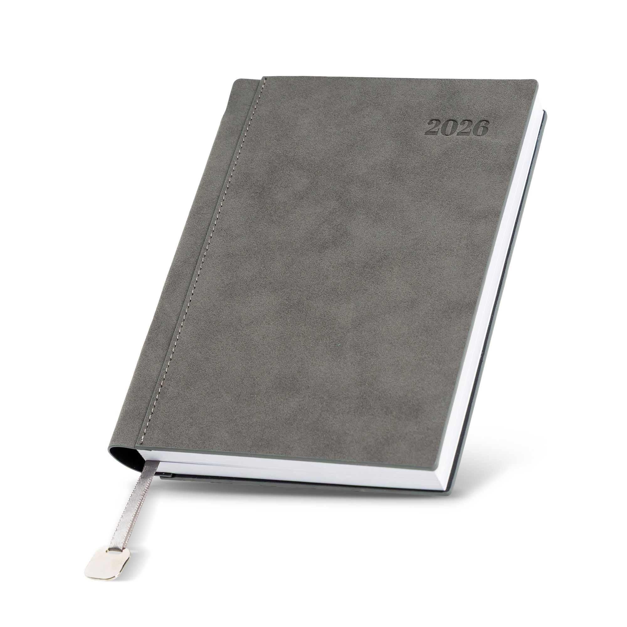 Bali – Agenda diária A5. Capa com toque de camurça com fitilho e chapa metálica.
