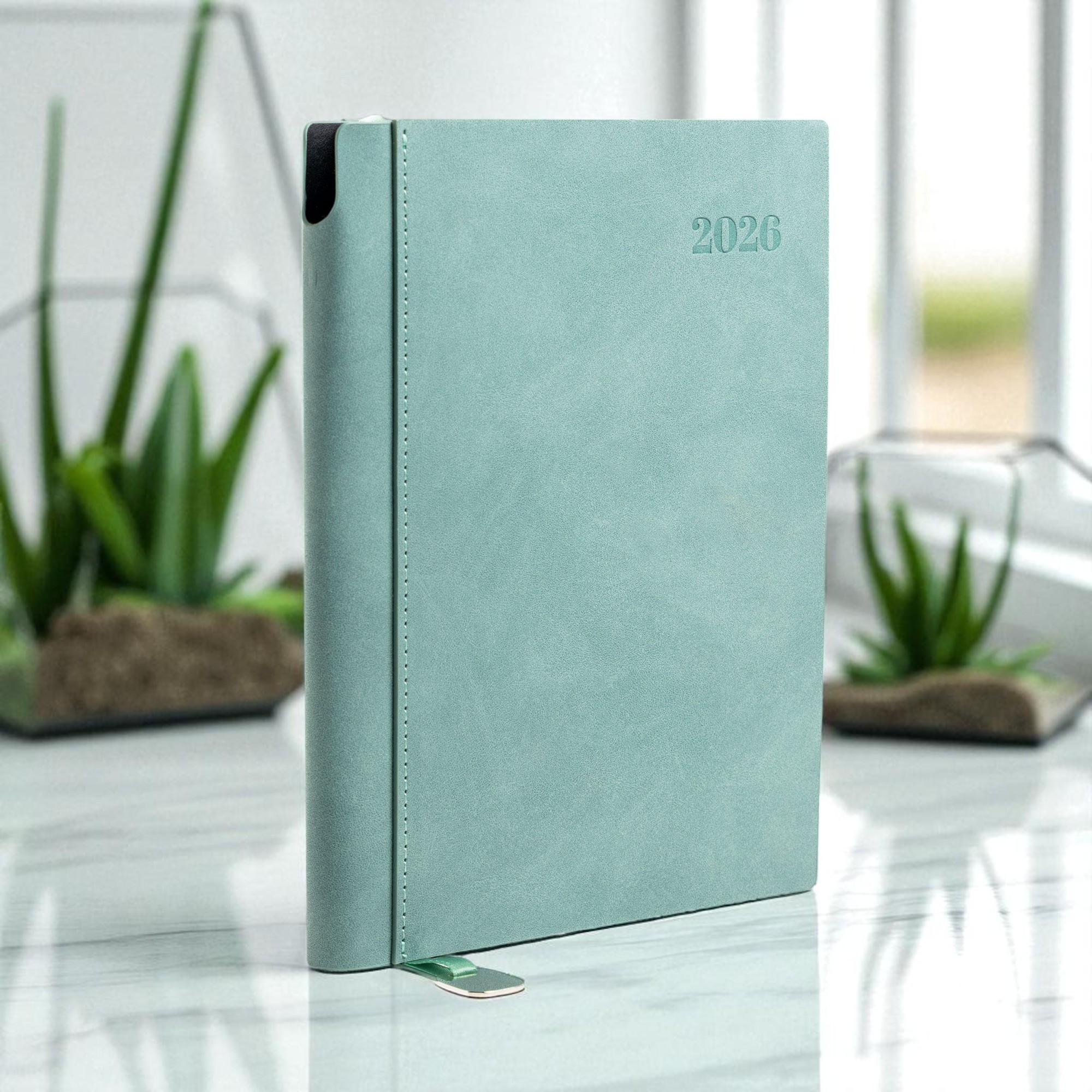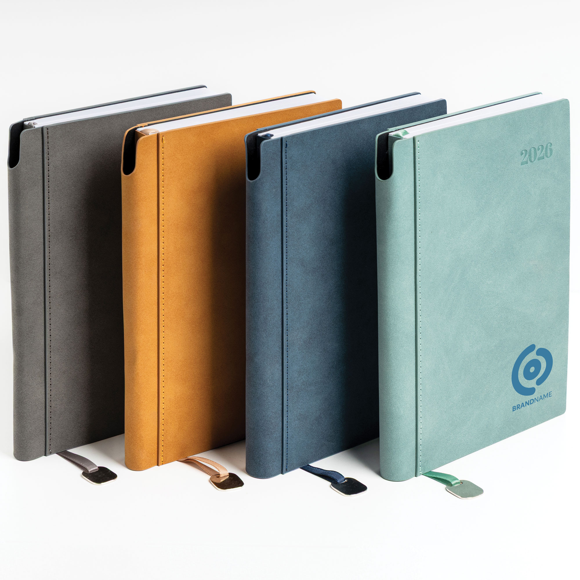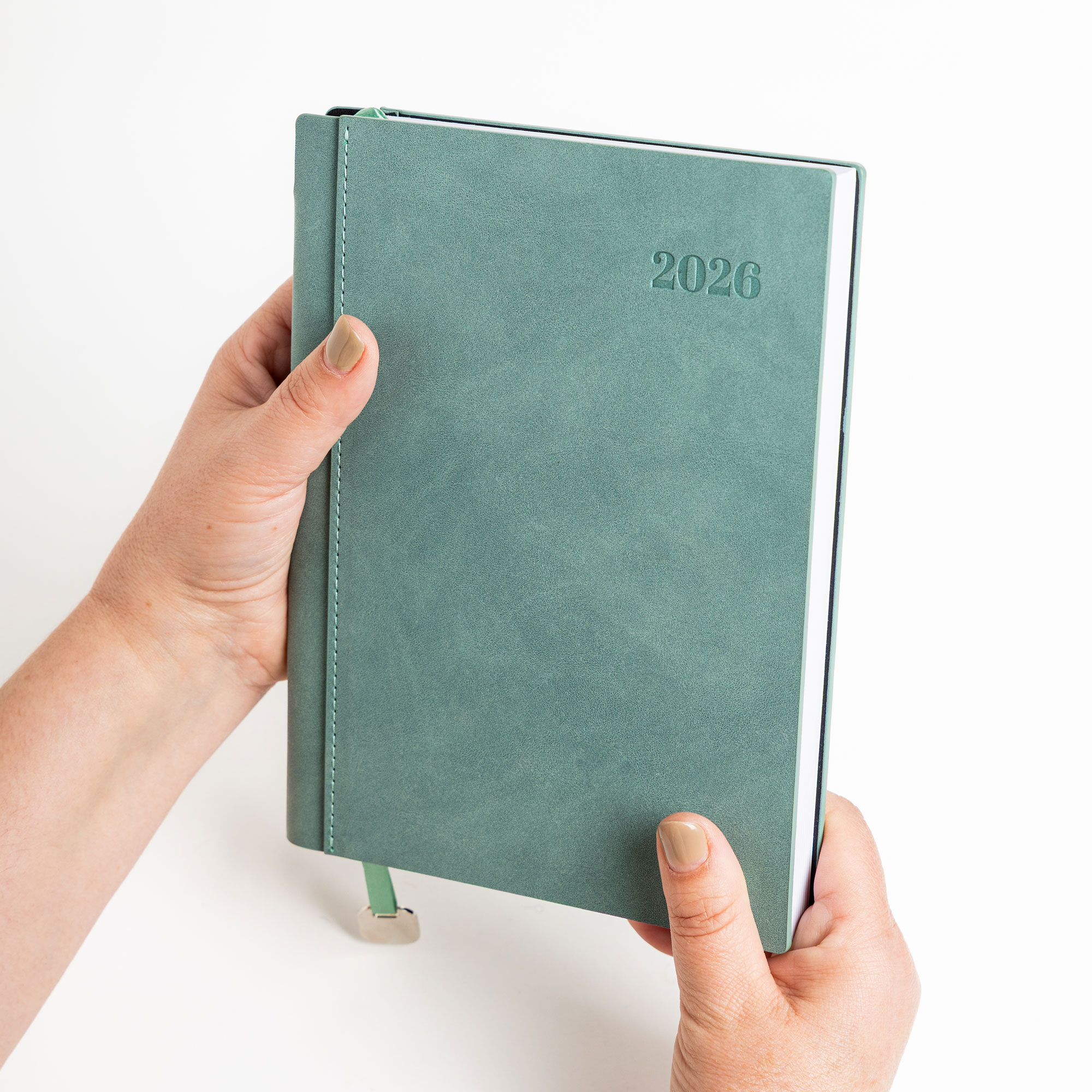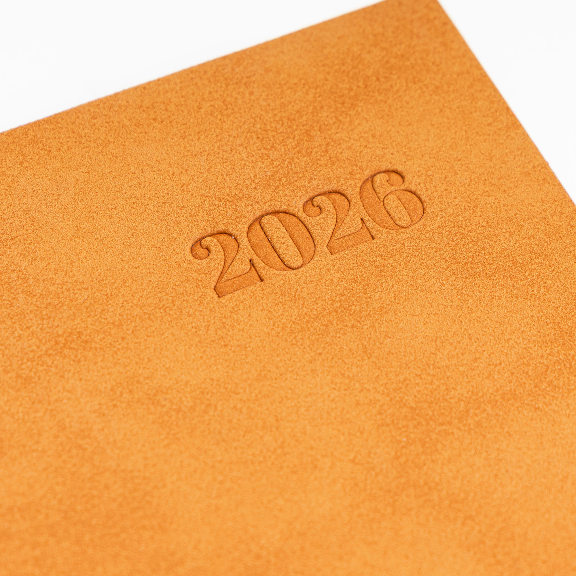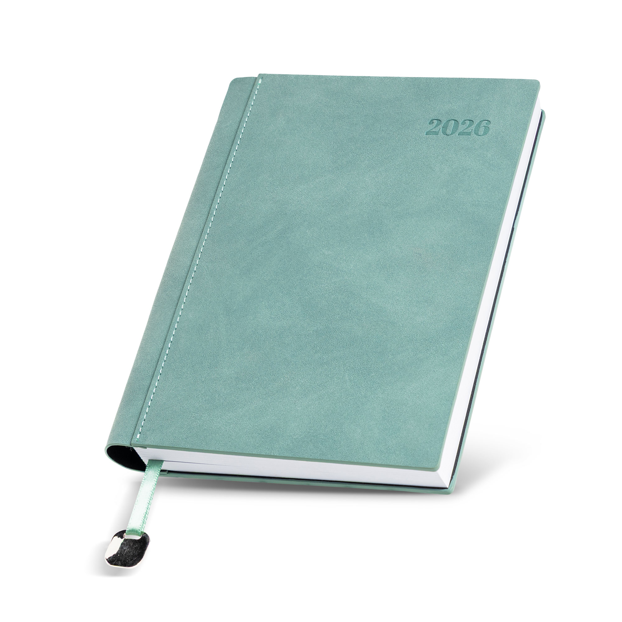 Bali – Agenda diária A5. Capa com toque de camurça com fitilho e chapa metálica.