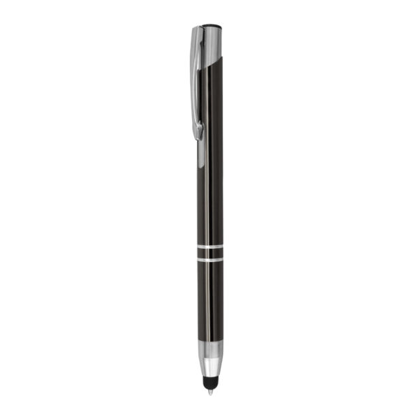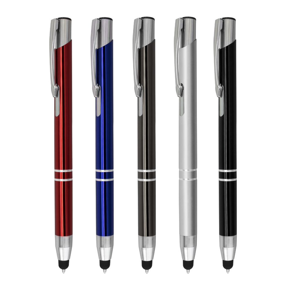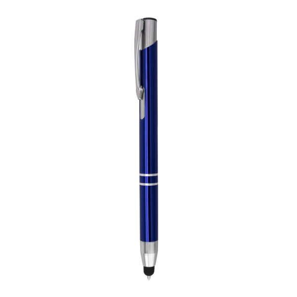 Esferográfica de alumínio e touch. Escrita azul e sistema pulsar.