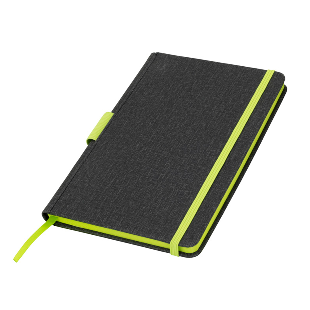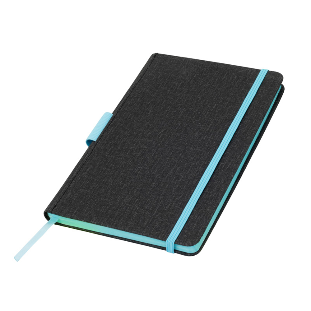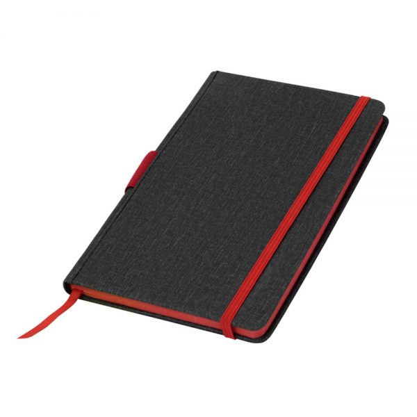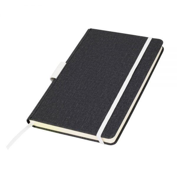 Bloco de notas A5 com capa em PU e porta-esferográfica. Com 91 folhas pautadas de 80g, este bloco tem uma capa em PU térmico, com uma textura visualmente semelhante a tecido. Detalhes coloridos abrilhantam a capa preta. Destaque para o porta-esferográfica, para que nunca perca a sua caneta favorita de vista.