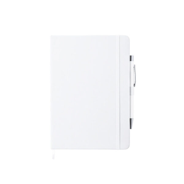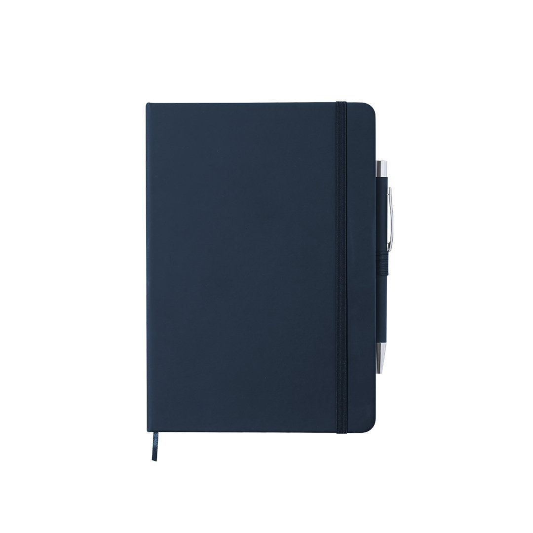 Conjunto de bloco e esferográfica a condizer. Bloco de capas rígidas com toque suave de acabamento em polipele, inclui suporte para a esferográfica, marca-páginas e fecho elástico, com interior de com 100 folhas pautadas. E também, a esferográfica de alumínio com acabamento aborrachado, com carga jumbo. Disponível numa variada gama de cores.