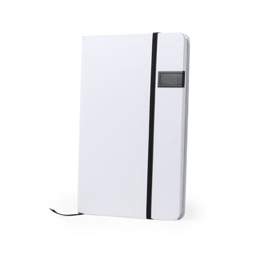 Bloco de notas elegante em branco, com memória USB de 16 GB de capacidade integrada na capa frontal. Fita elástica, memória USB e marcador a condizer, numa ampla gama de cores. Inclui 100 folhas pautadas.