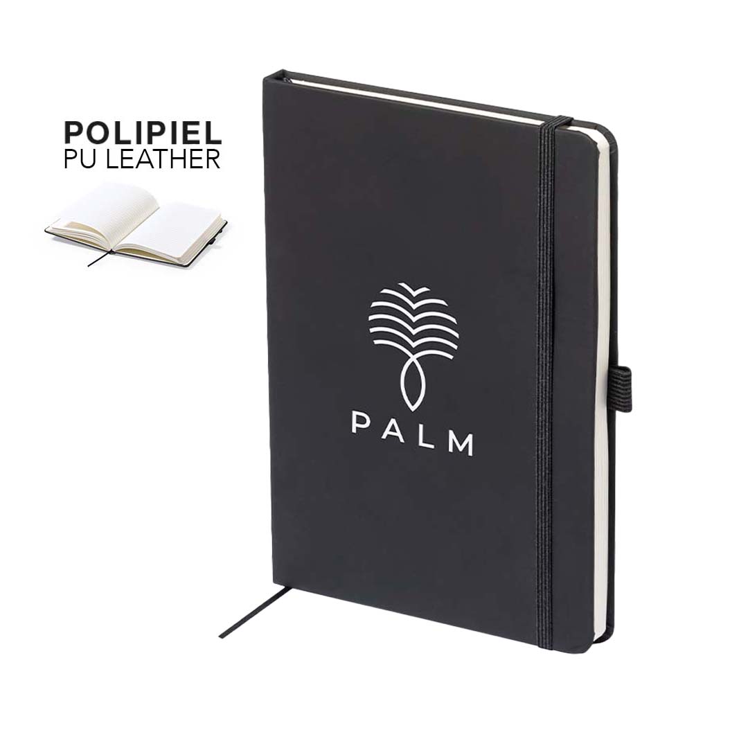 Bloco de notas fabricado em polipele de elegante acabamento em preto. Com capas duras, marca páginas e elástico de fixação a condizer. Interior com 100 folhas pautadas e suporte para esferográfica (esferográfica não incluída).