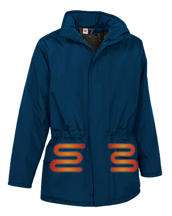 Tecido exterior otoman impermeavél Poliamida/Poliéster 200 grs/m2. Acolchoado 100% poliéster 180 grs/m2. Gola alta. Fecho inteiro baixo carcela com velcro. Capucho com cordão ajustavél oculta na gola. Cordão regulavél no interior na cintura. Punhos duplos com elástico. 2 bolsos dianteiros com tapa e velcro. 1 bolso interior no peito esquerdo. Sistema de aquecimento em 3 zonas: peito direito, peito esquerdo e lumbar. Caixa 5 unidades: 1 tamanho. Bolsas individuais.