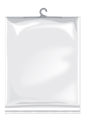 Polipropileno transparente 100% virgem. Galga 200. Material reciclável. Cabide de plástico no topo. Um orifício respiração. Lapela com adesivo reutilizável.