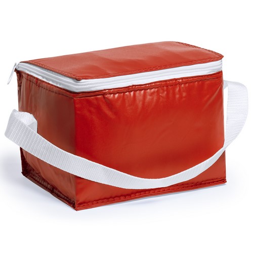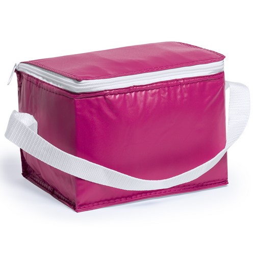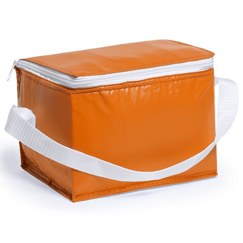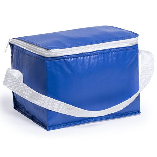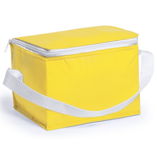 Bolsa refrigeradora com capacidade para 6 latas em PVC resistente de cores vivas. Interior isotérmico de acabamento em alumínio. Com fecho de correr e alça de transporte na cor branca.