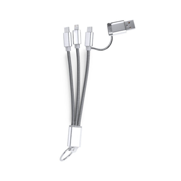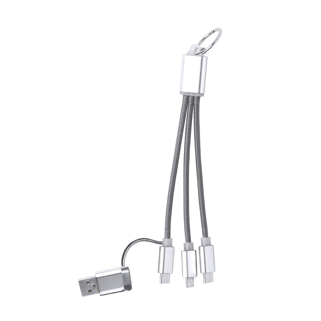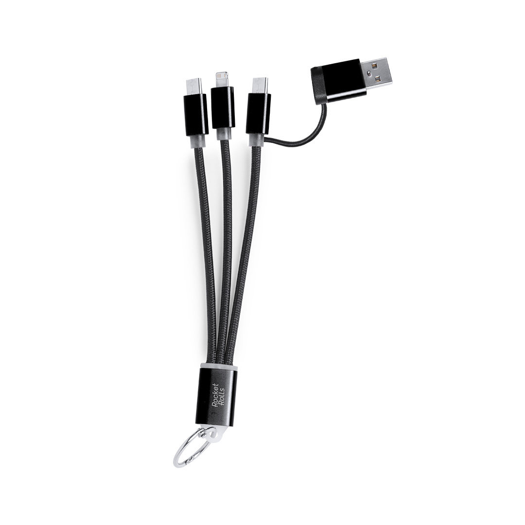 Cabo carregador com conexão dual micro USB/Lightning e tipo C (entrada e saída). Conectores de alumínio e chapa especialmente desenhada para gravação a laser.