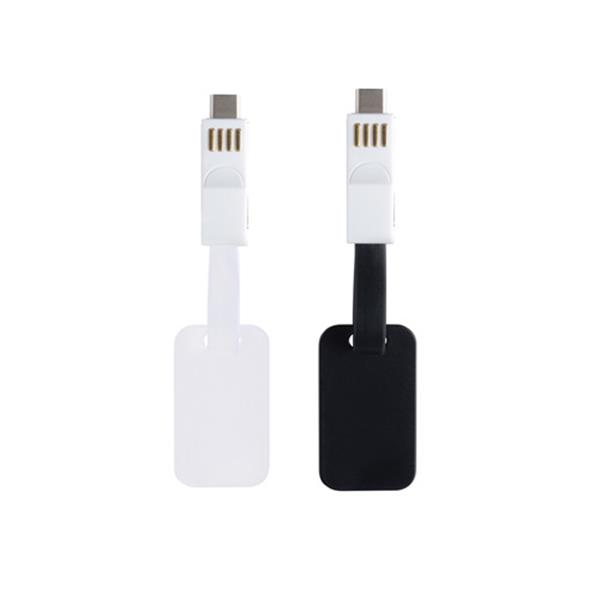 Cabo de carregamento 3 em 1 magnético, com chapa em plástico. Na Era da tecnologia em que vivemos, nada melhor que ter sempre à mão um cabo de carregamento. Este item permite que traga um sempre consigo. O íman que une as duas faces do cabo, dá-lhe a opção de o trazer no seu porta-chaves. Incluí ainda uma chapa de plástico que o torna personalizável e diferente dos outros cabos comuns. Com USB, MicroUSB, Ios e TypeC.