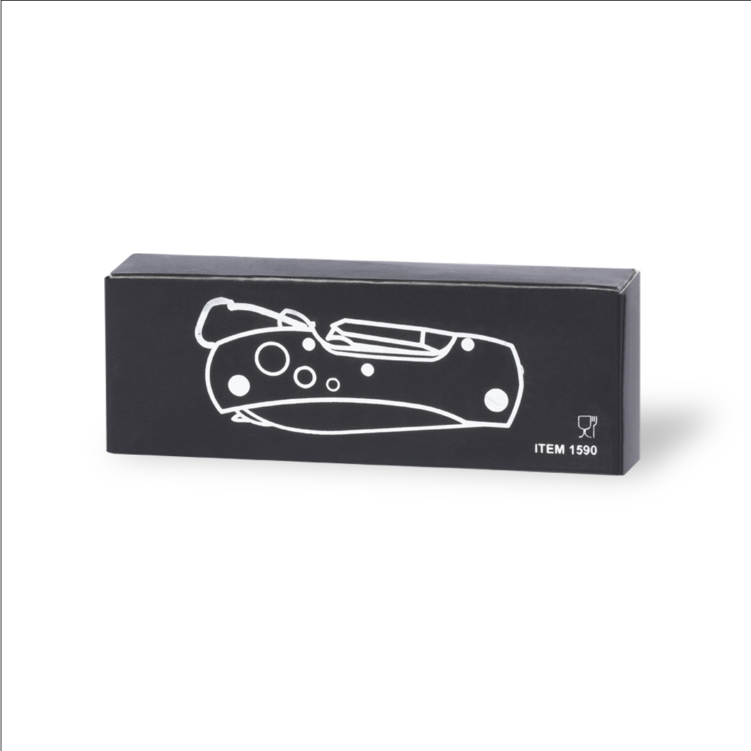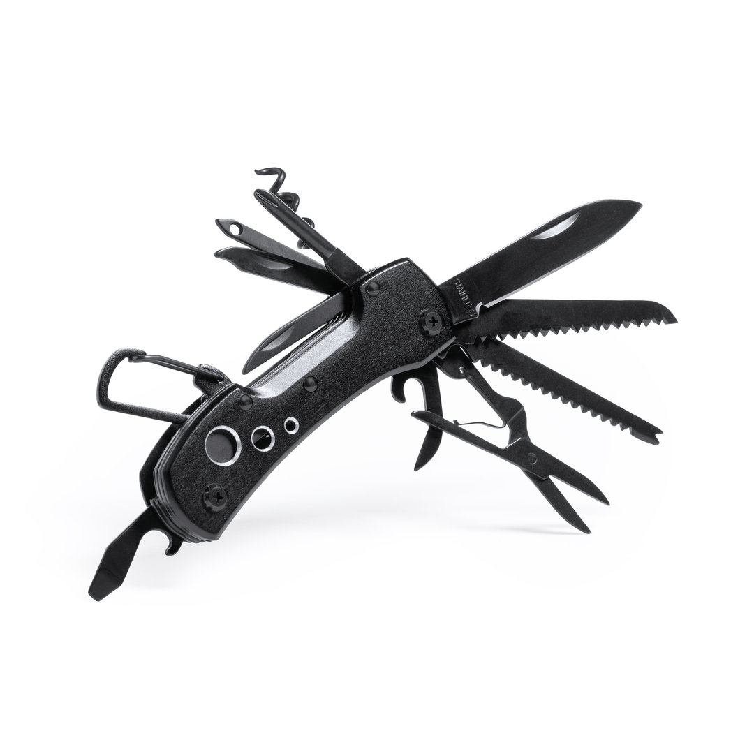 Canivete multiusos com acessórios em aço inox de acabamento preto e resistente pega a condizer em alumínio, com mosquetão integrado na pega. 13 funções, entre elas colher e canivete chave de fendas, lima abre-cápsulas y tesoura. Dobrável e de tamanho compacto, apresentada numa caixa individual de design preta.