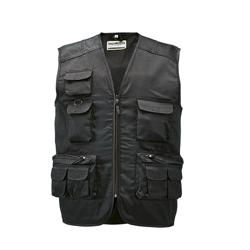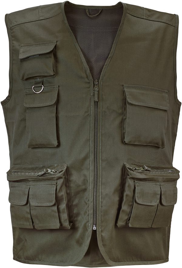 Colete multi-bolsos em sarja de algodão, fecho em nylon