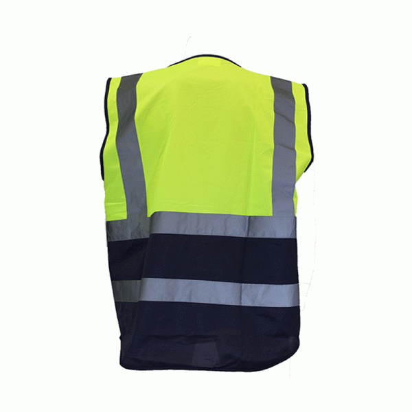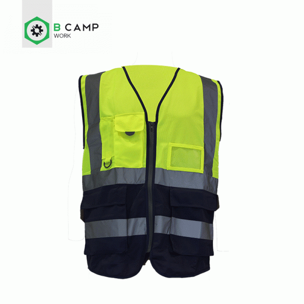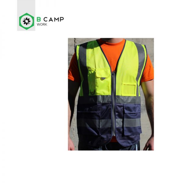 Colete reflector de alta visibilidade multi-bolsos, com quatro faixas reflectoras; com fecho Bolso para cartão de identificação. Certificado CE.