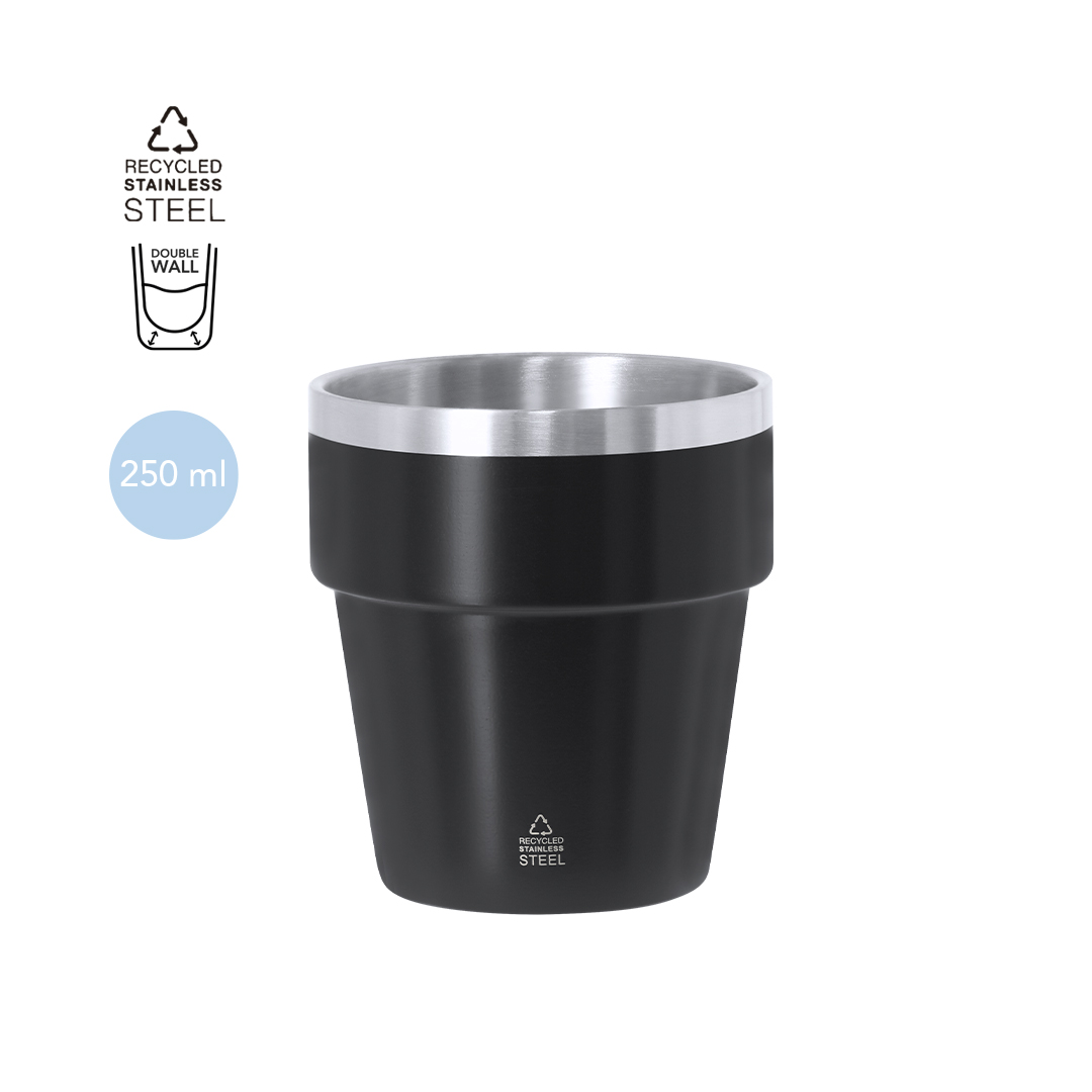 Copo térmico fabricado em Aço Inox Reciclado de dupla parede e 250 ml de capacidade.