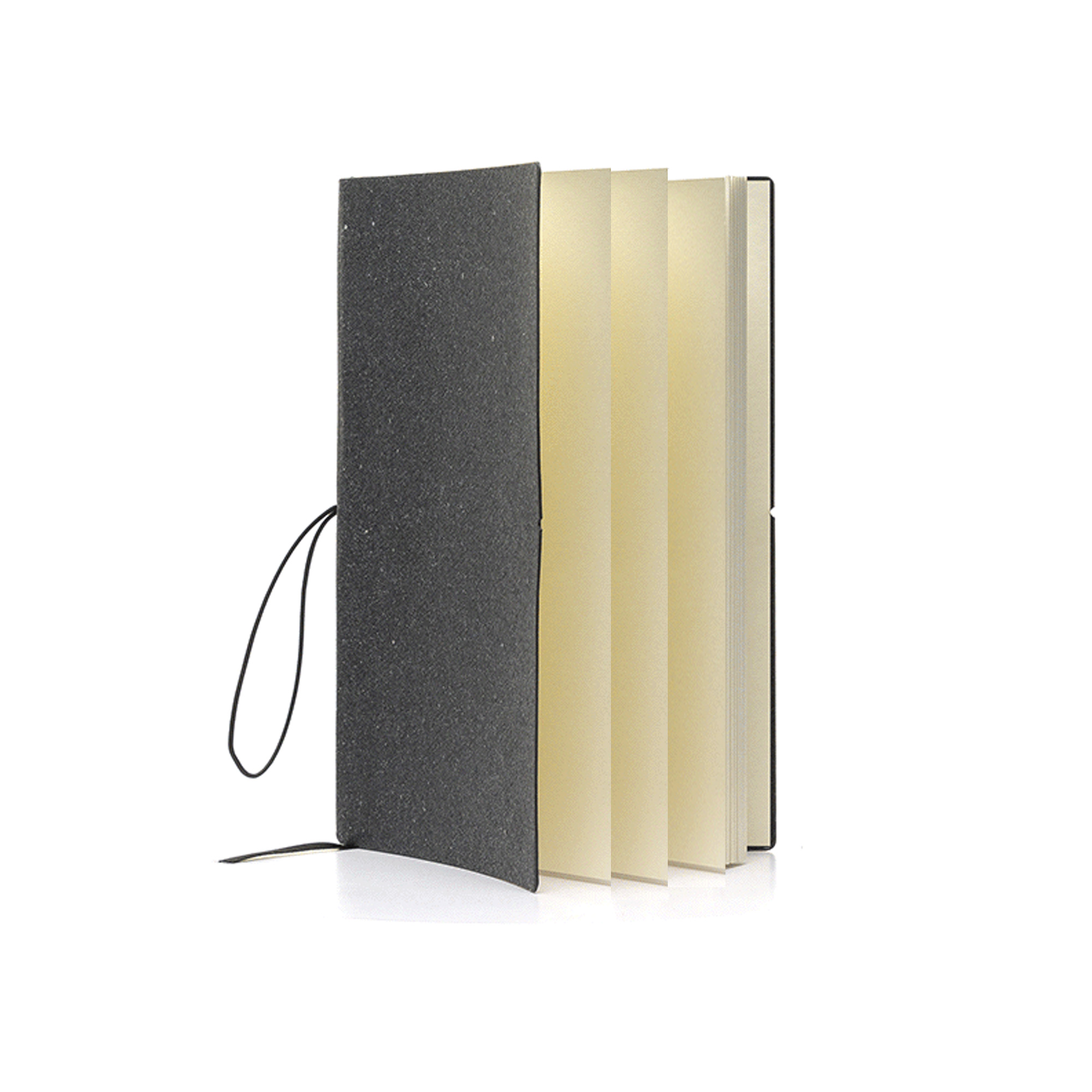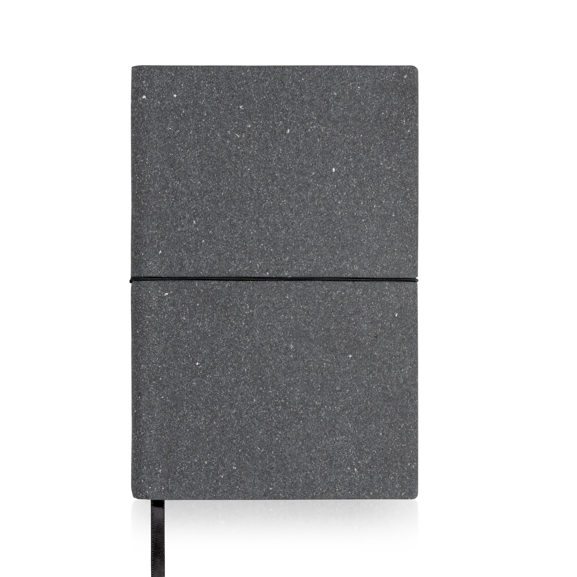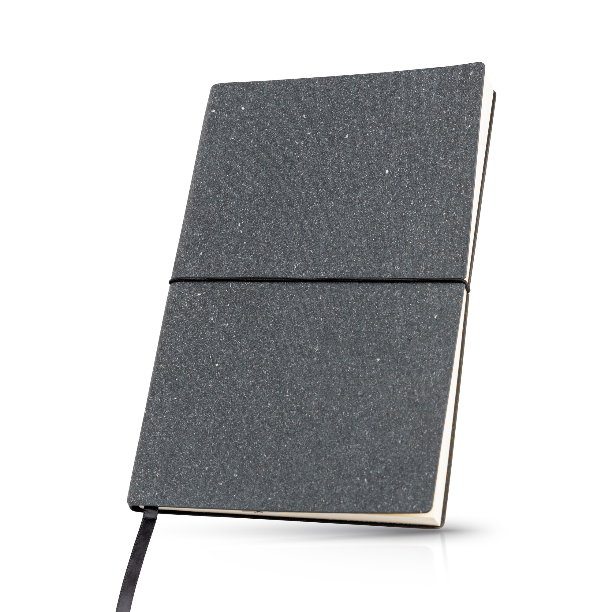 Um brinde que prima pela diferença, especialmente pela sua capa em pele reciclada. Em tamanho A5, com elástico tubular horizontal. Contém 160 páginas, em papel creme de 80gr pontilhado.