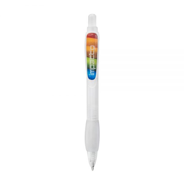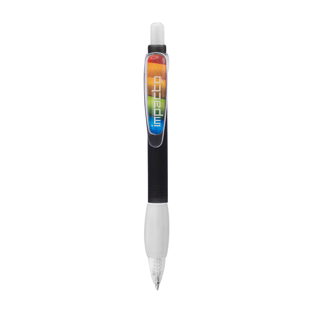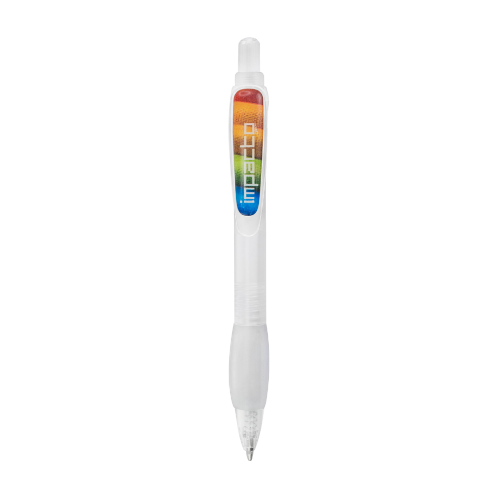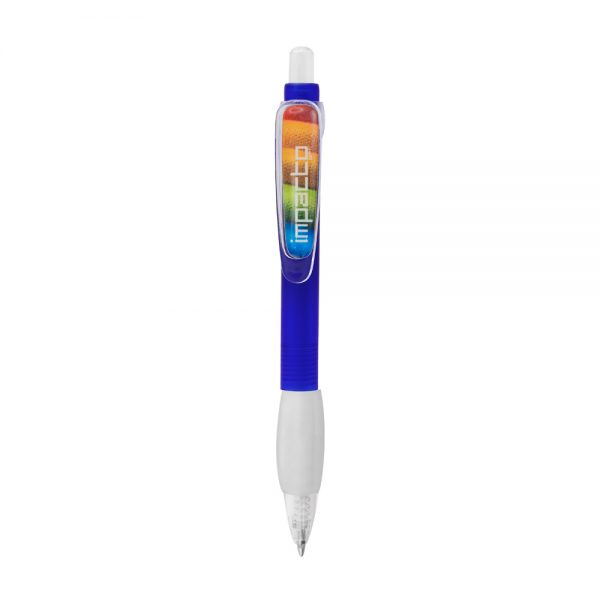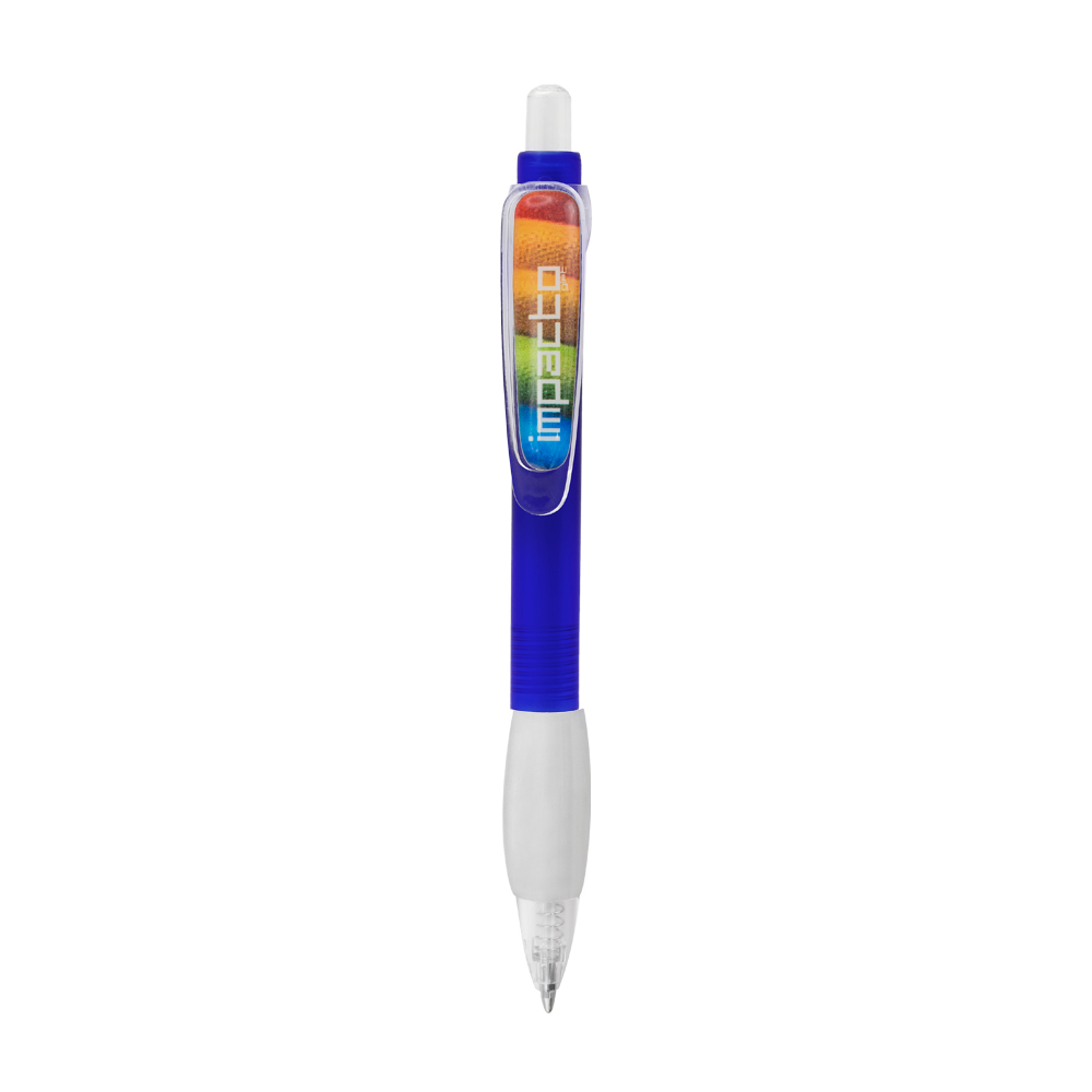 Esferográfica de plástico, clip para impressão com resina. Escrita azul, sistema pulsar. Com clip largo e adaptado à personalização com resina. Ideal para combinar com a referência 370486.
