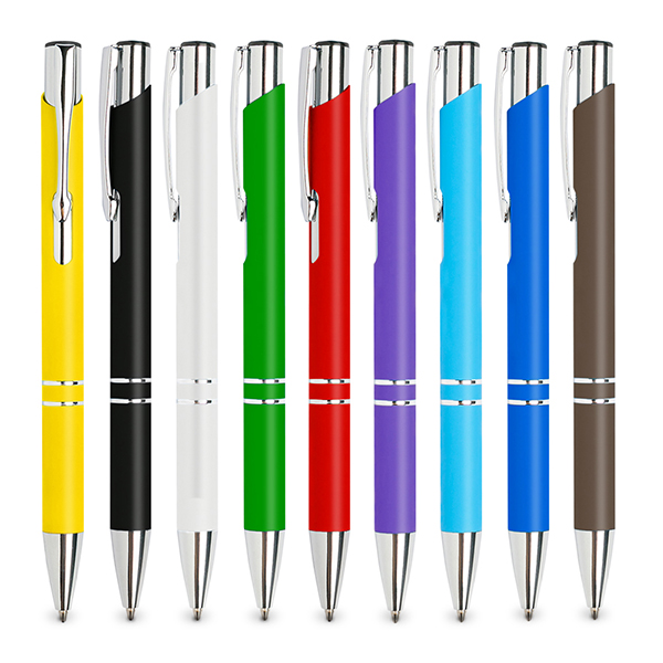 Esferográfica em alumínio, corpo com toque de borracha com 2 anéis. Escrita preta, sistema pulsar. Esferográfica com uma vasta gama de cores. Os detalhes cromados e o toque suave atribuem-lhe um ar premium.