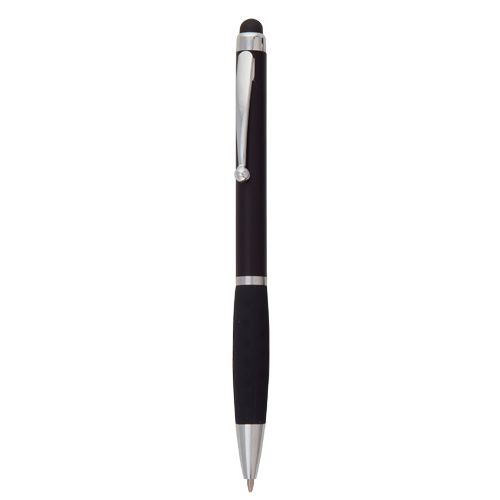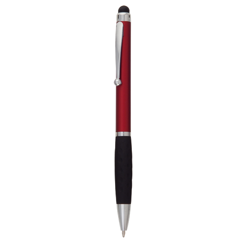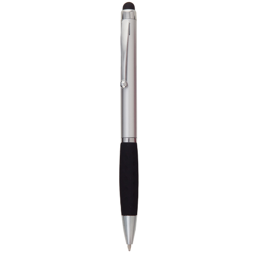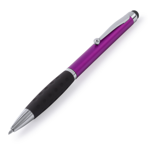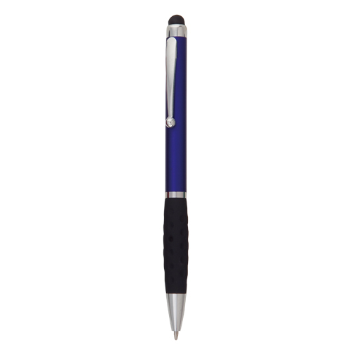 Esferográfica ponteiro de mecanismo giratório de elegante desenho bicolor com acessórios na cor prata brilhante e corpo de suave acabamento em apelativas cores metalizadas brilhantes. Com clip metálico e anilha a condizer. Tinta azul.