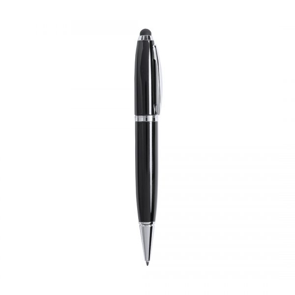 Esferográfica tecnológica multifunções em cores sóbrias, com memória USB de 16GB de capacidade integrada na tampa e ponteiro de borracha macio da mesma cor. Corpo em acabamento metálico brilhante, com abertura rotativa e tinta azul. Apresentado numa elegante caixa de cartão branca com fecho magnético e interior em esponja macia.