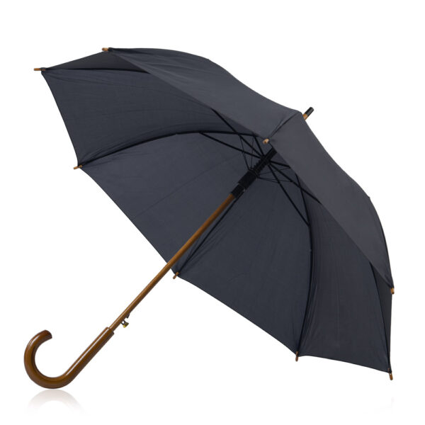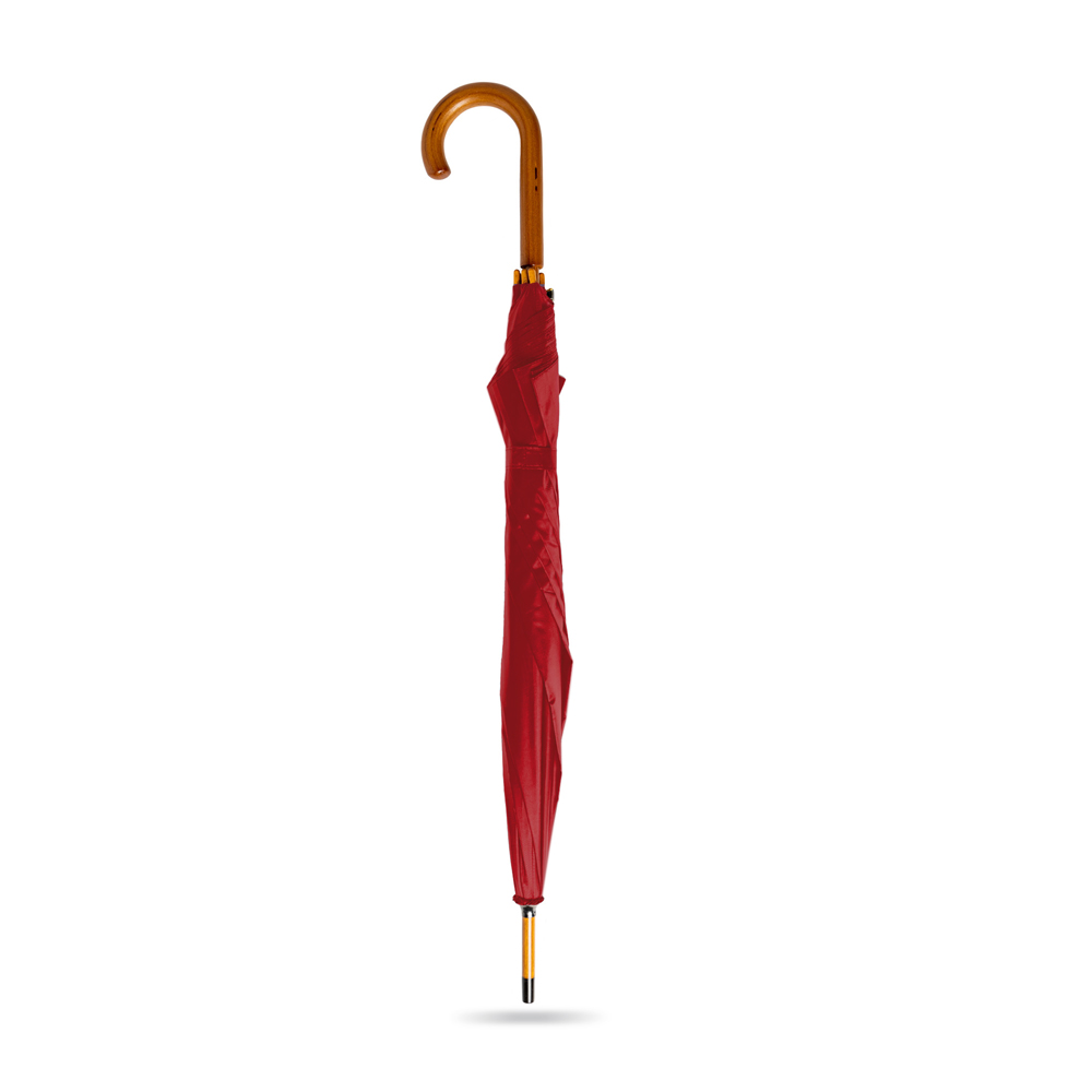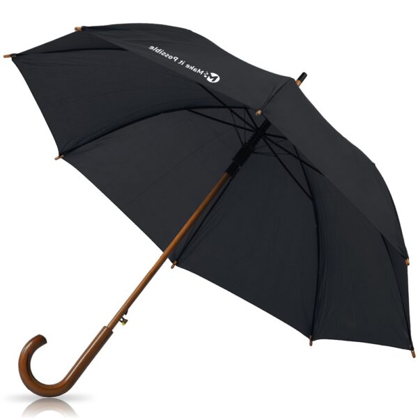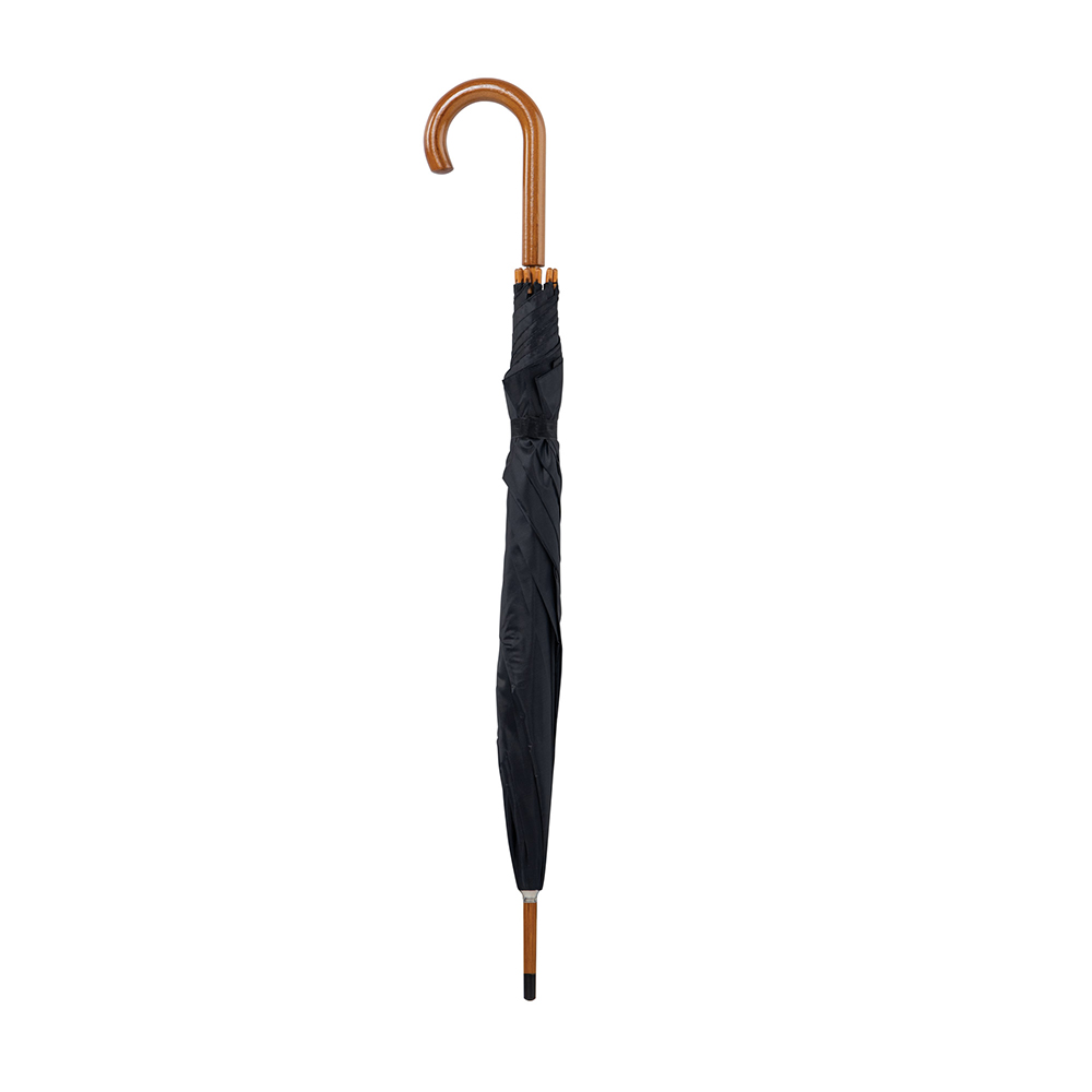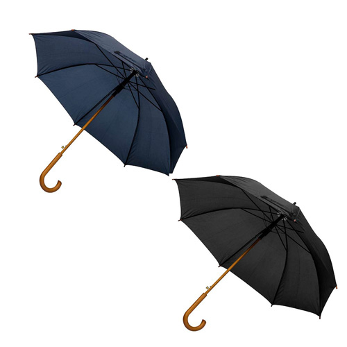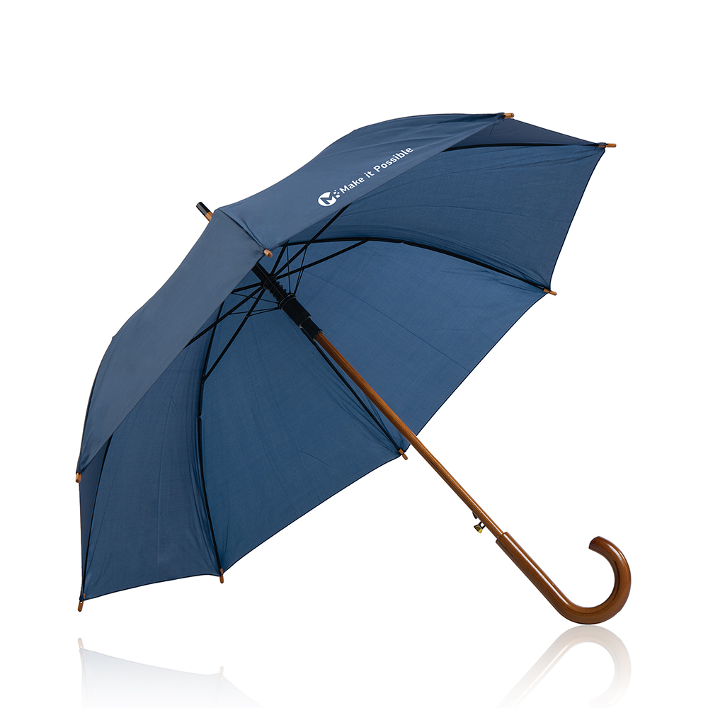 Guarda-chuva automático, em P-190T, cabo em madeira. Um guarda-chuva com abertura automática. Modelo clássico, com cabo de madeira e pega em “J”. Não seja apanhado desprevenido e fique com os seus clientes em todas as tempestades da vida.