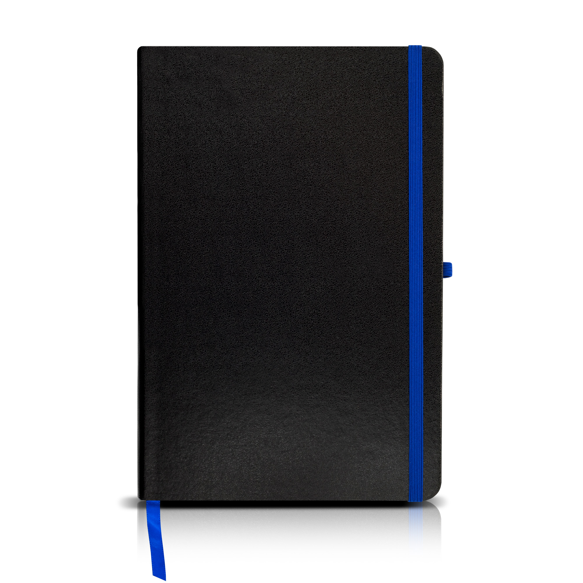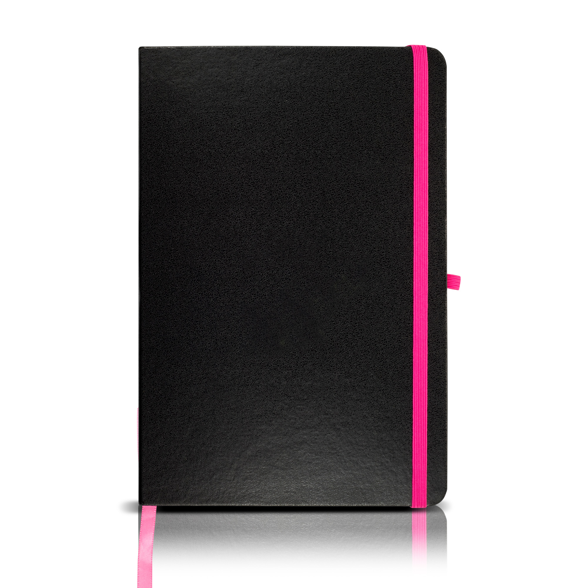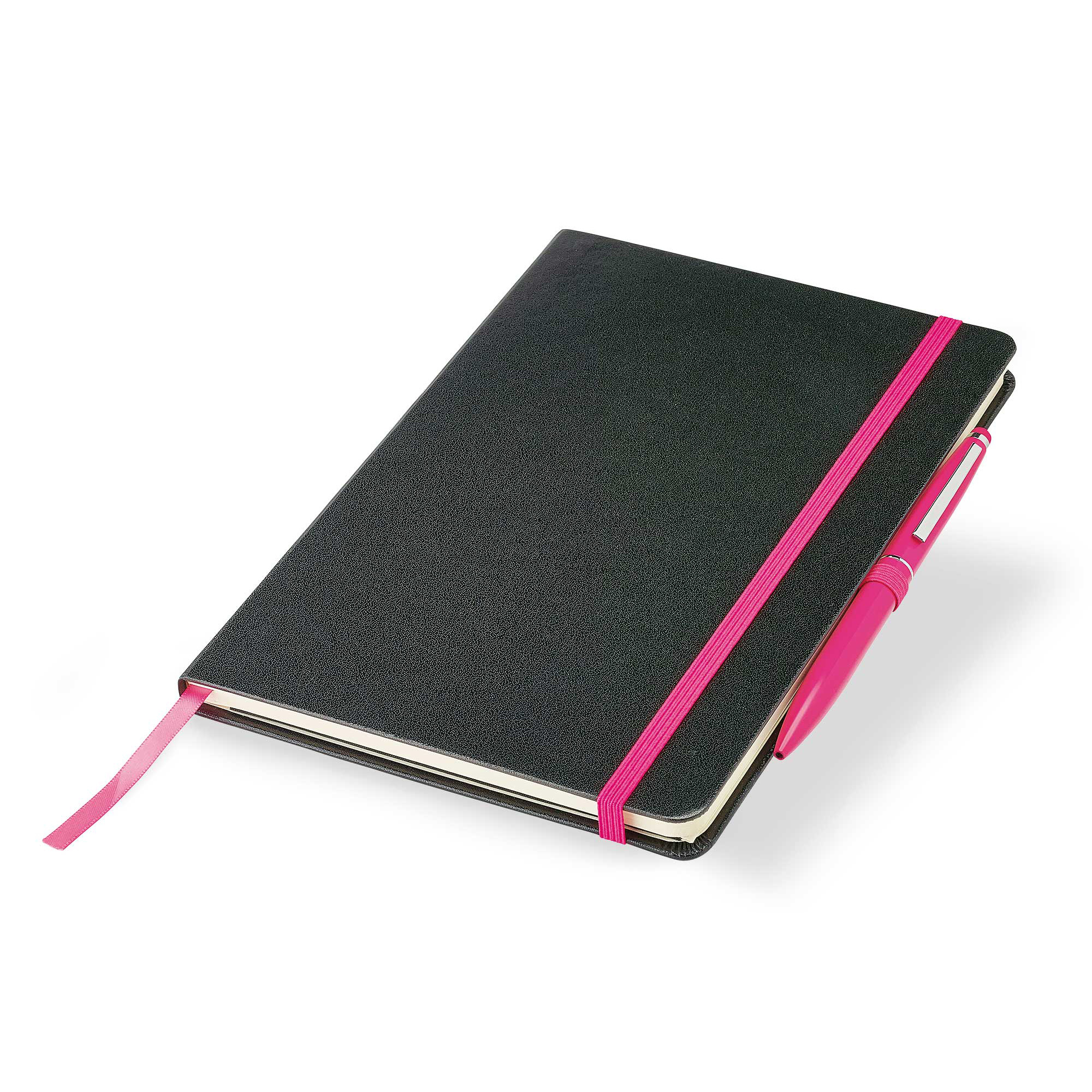 Happynote , com capa em cartão e bolsa. O contraste deste bloco chama toda a sua atenção. Com uma capa preta, dá aso ao destaque do elástico, fitilho e porta-canetas colorido. Um bloco com 80 folhas lisas de 70g, ideal para destacar uma personalização colorida.