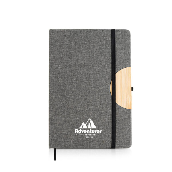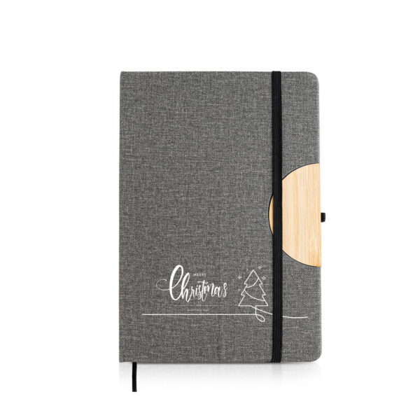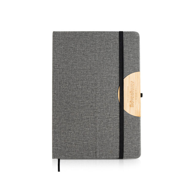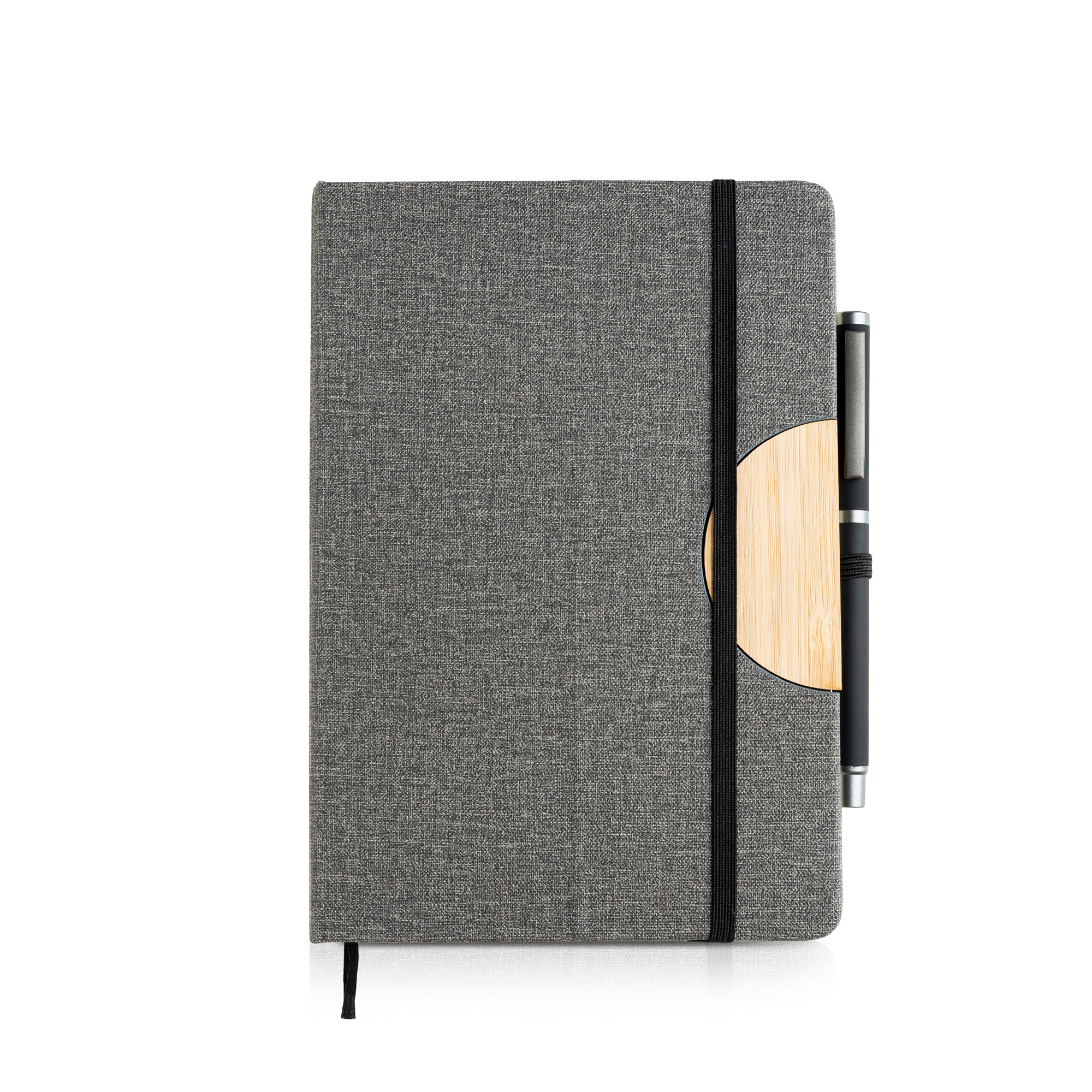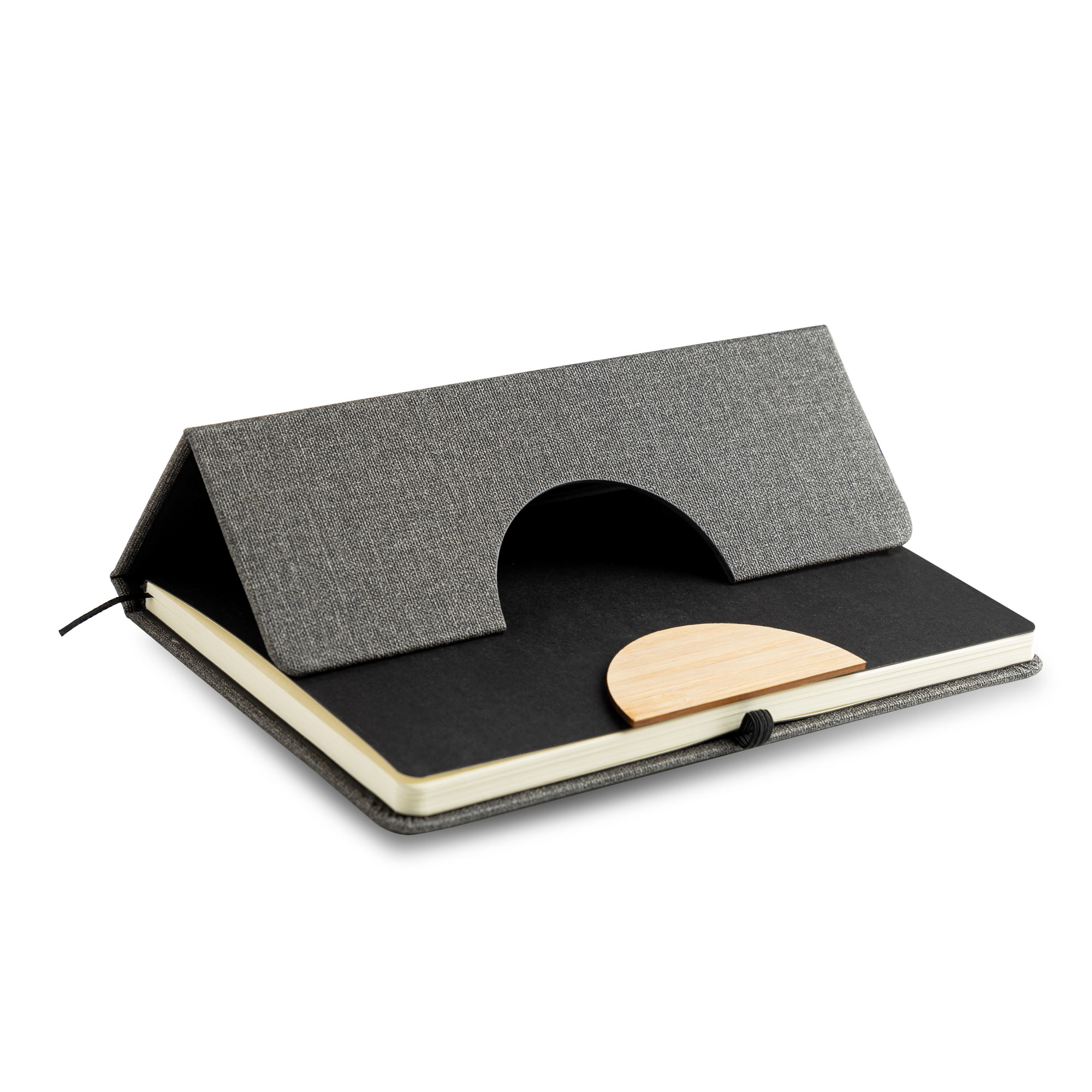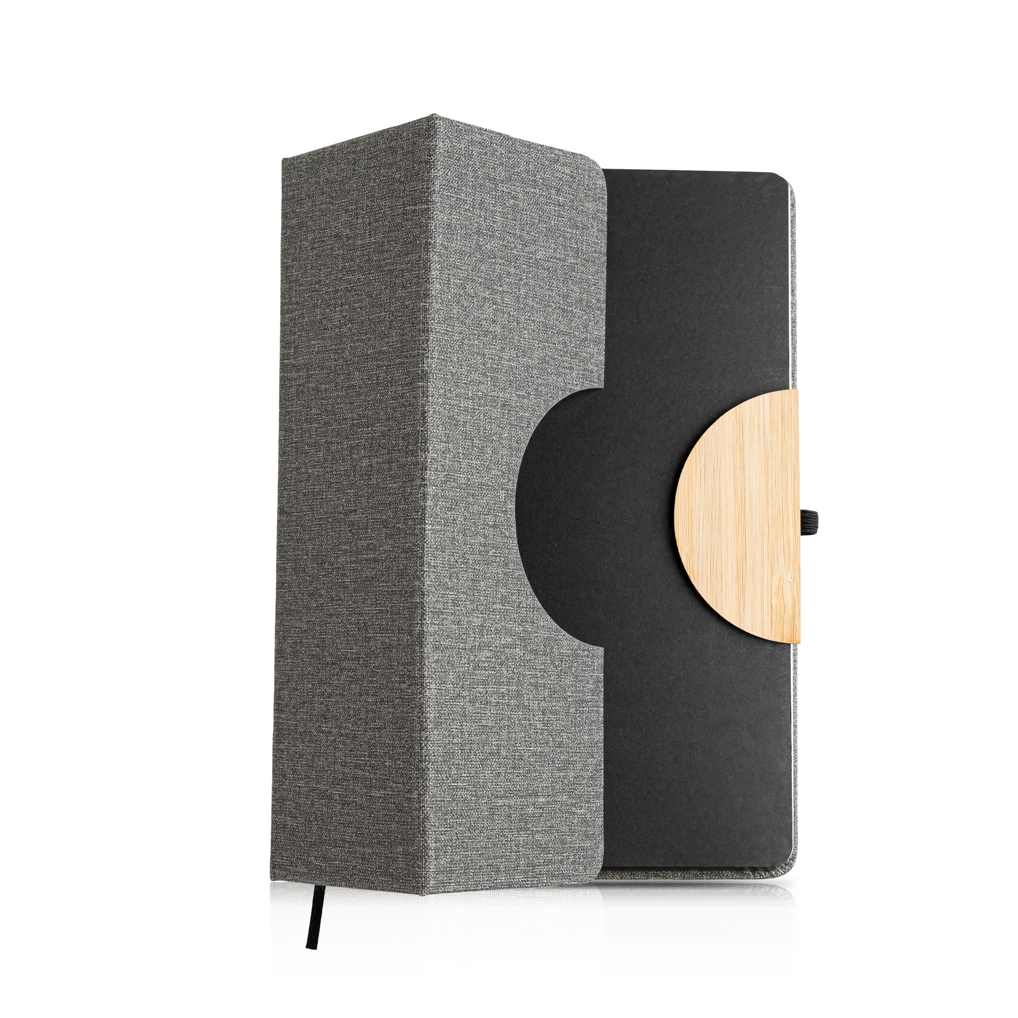 Holderbook Bloco A5 em linho, com detalhe em bambu para suporte de telemóvel.