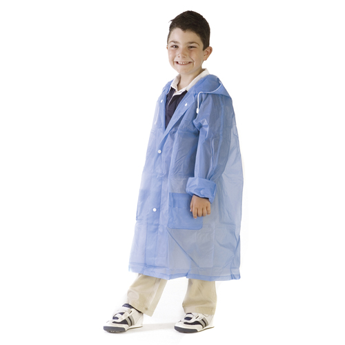 Impermeável de criança com bolsa, em PVC 15 mm. Brincar à chuva é divertido, mas quanto mais protegido melhor. Para que a criança não molhe a roupa, nada melhor que esta capa impermeável. Transparente, fecha através de molas. Tem gorro incluído.