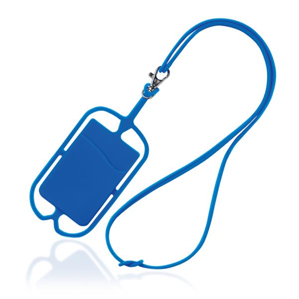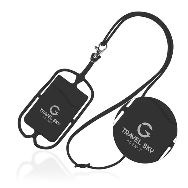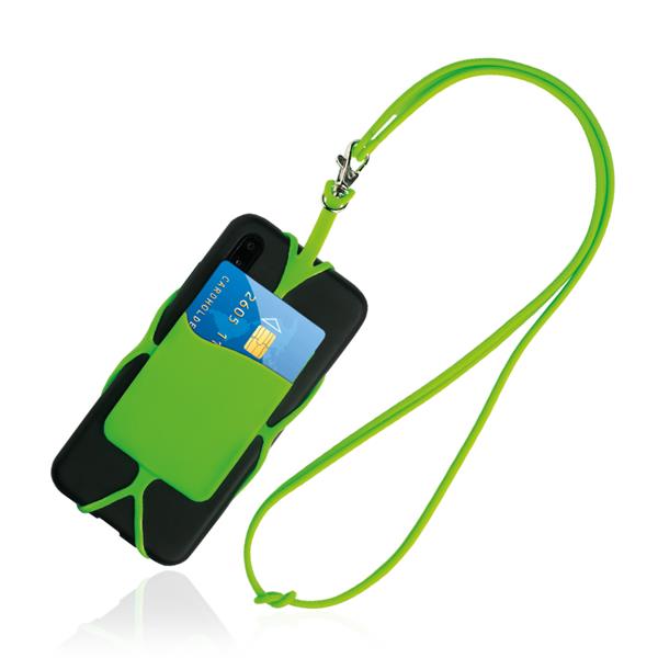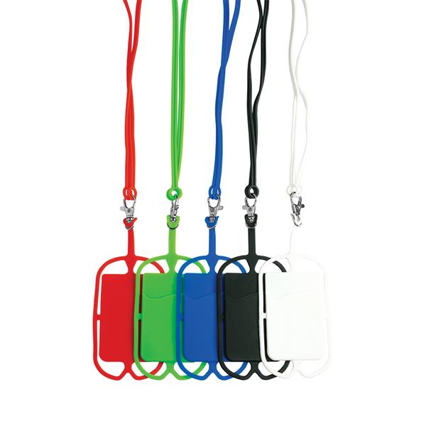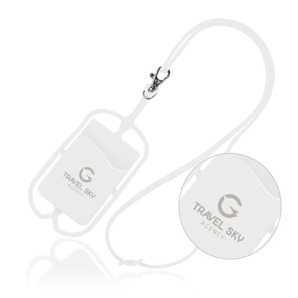Lanyard em silicone, com porta-cartões e suporte para smartphone. Mosquetão metálico. Boa área de gravação.