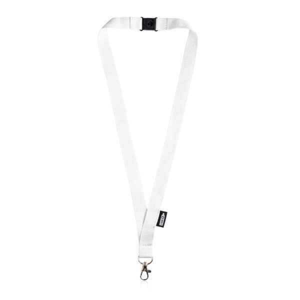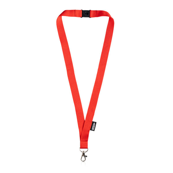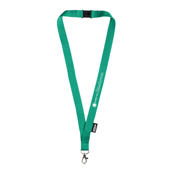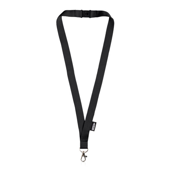 Lanyard em RPET, com mosquetão metálico e fecho de segurança.