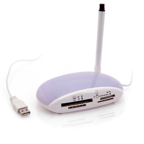 Leitor de cartões original com design curvo bicolor e tampa superior translúcida com iluminação traseira. Com caneta para escrever mensagens na parte retroiluminada e compatível com cartões SD, MiniSD, mmC, XD, XS, CF. Apresentado em caixa individual preta.