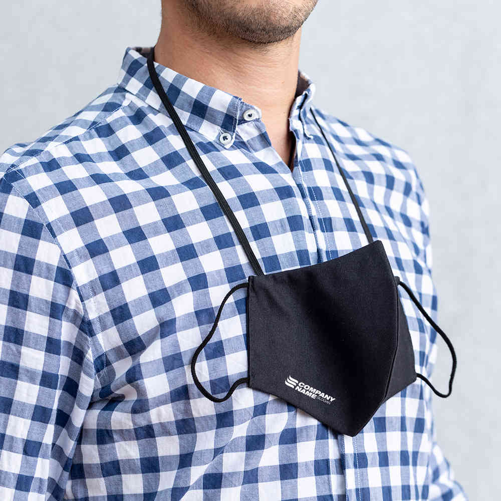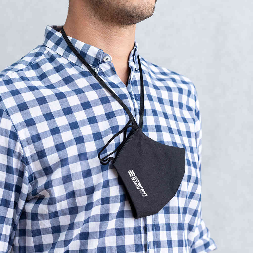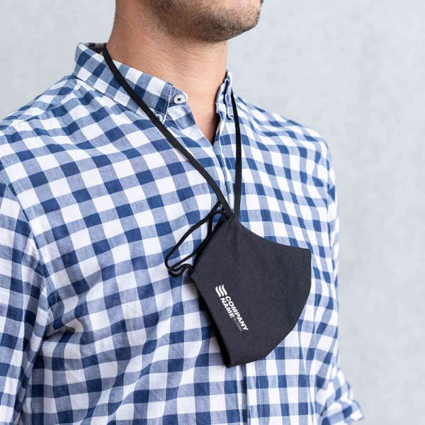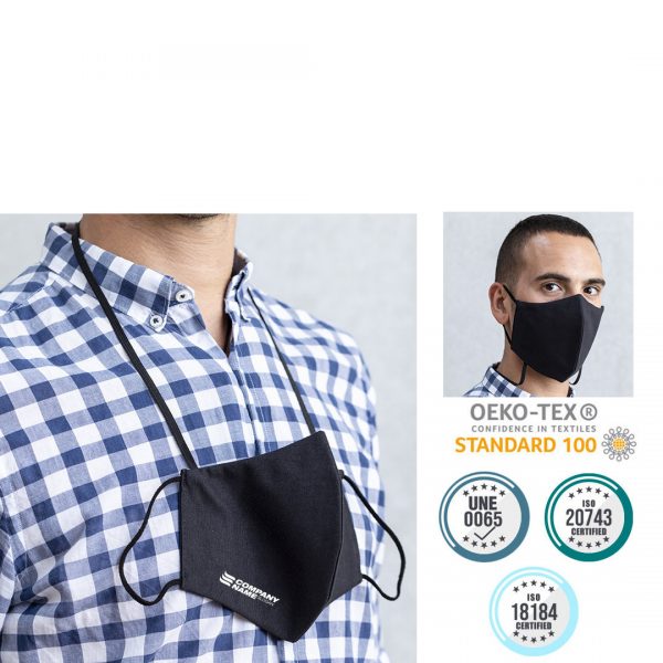 Máscara higiénica reutilizável com fita elástica integrada para levar no pescoço, permitindo transportá-la cómodamente e sem transtornos. Ao mesmo tempo, proporciona um rápido e fácil acesso à máscara quando necessária usá-la.