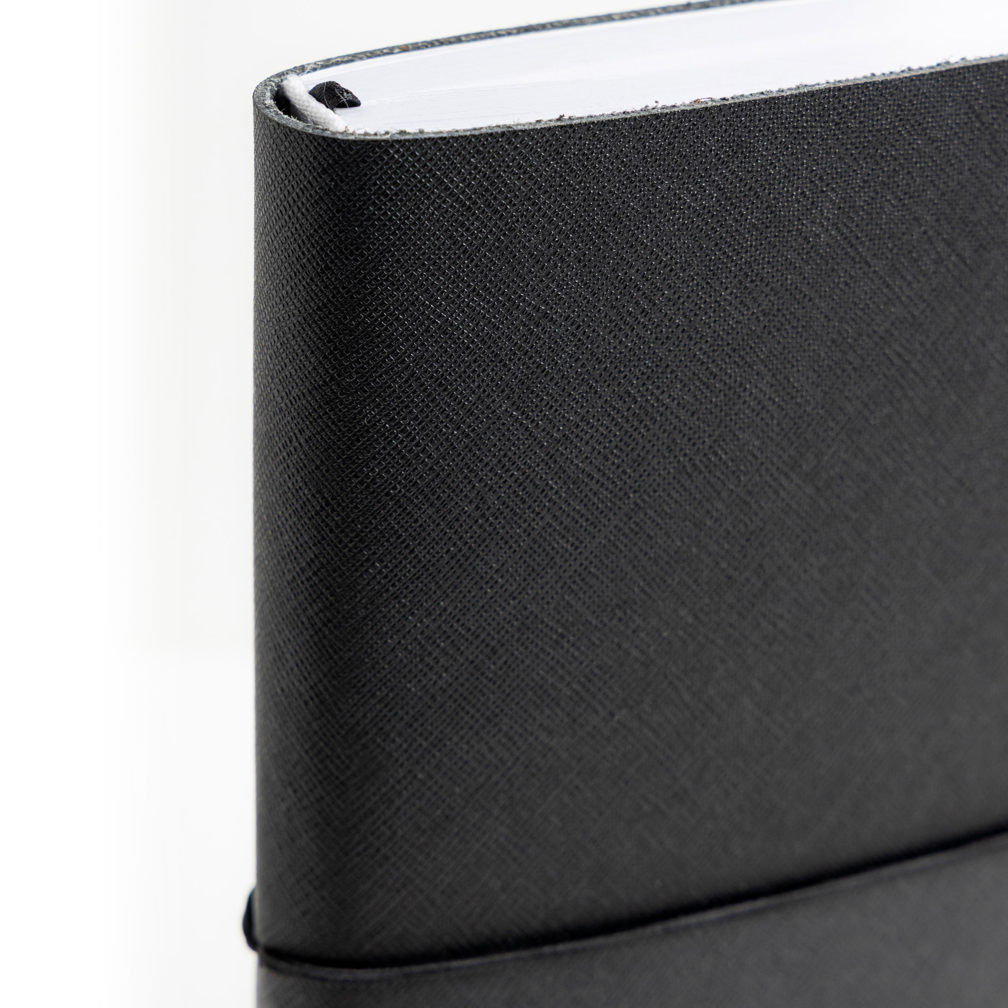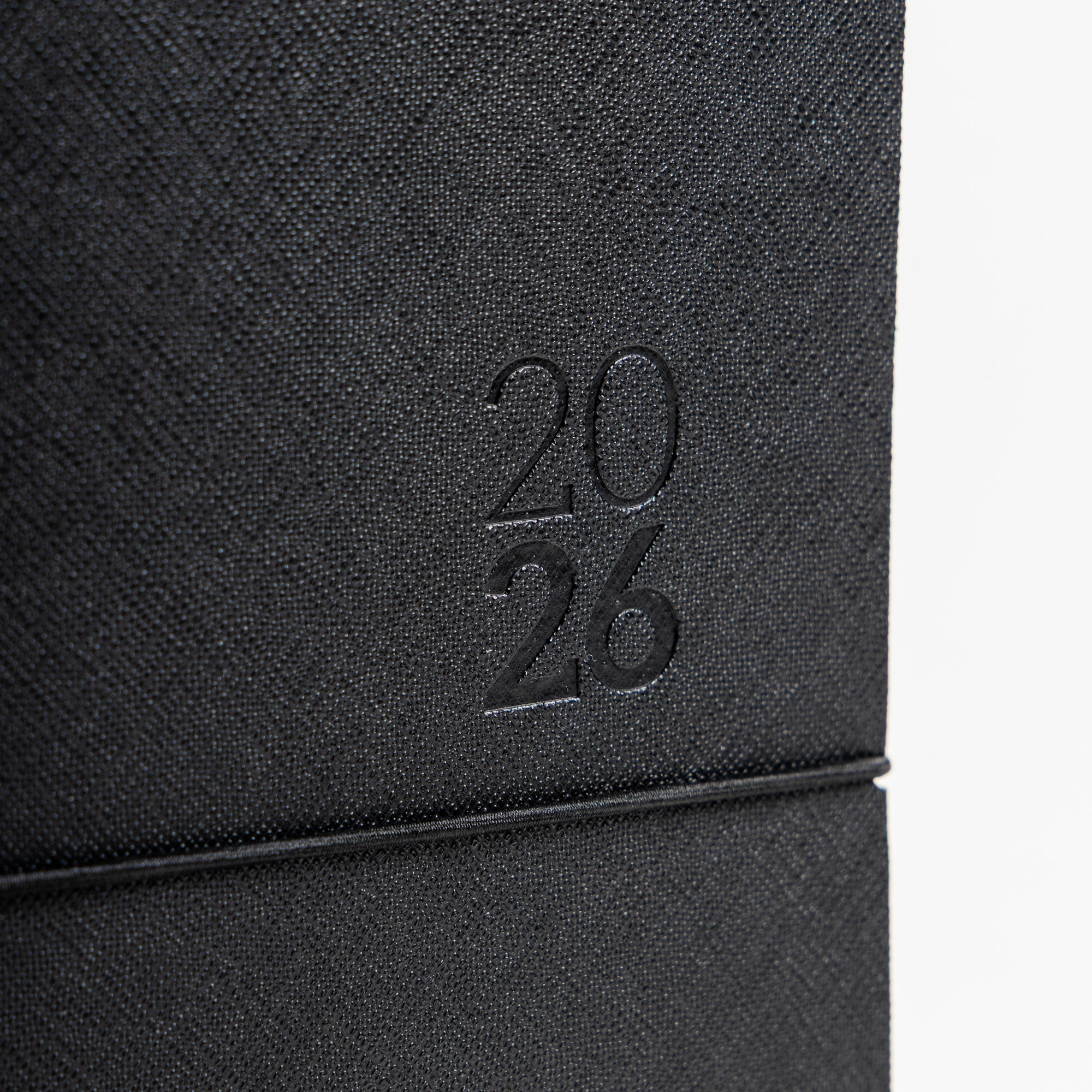 Capa em mistura de pele com 67% fibras naturais, elástico tubular horizontal e fitilho preto.