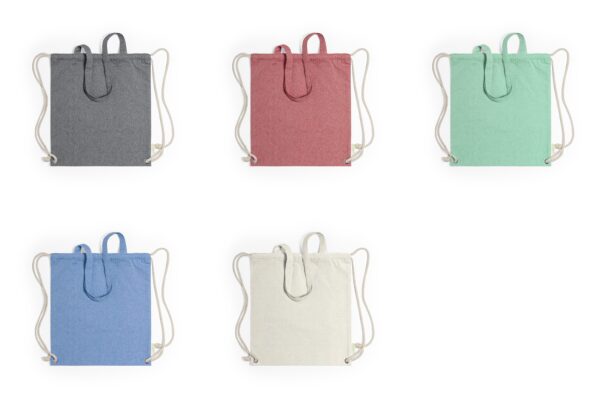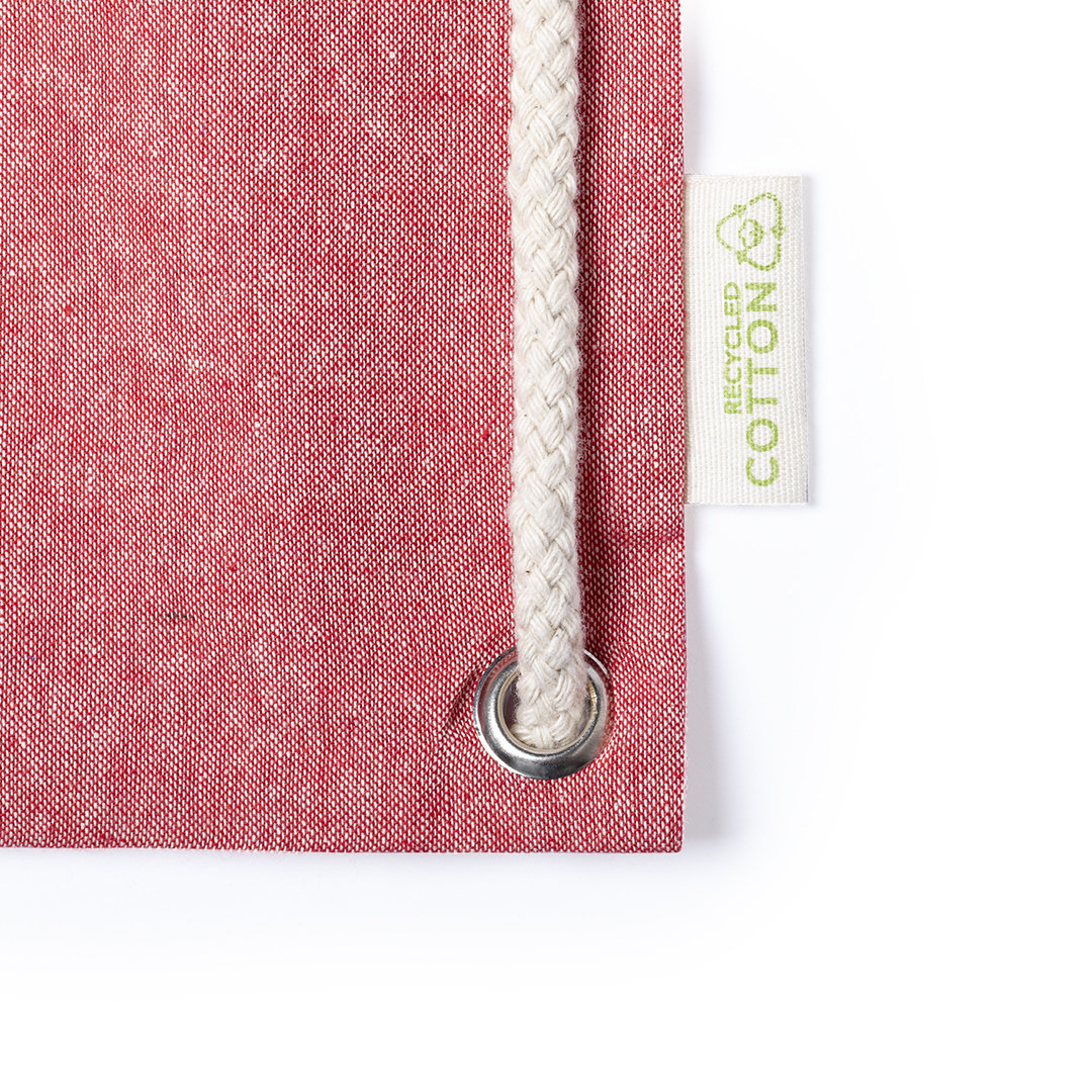 Saco mochila de cordões de linha nature, em resistente algodão reciclado 140g / m2, com alças de transporte de 70cm a condizer. Cordões de algodão cru, com argolas de metal reforçadas e distintivo algodão reciclado na etiqueta. Disponível numa variada gama de cores. Resistência até 9kg de peso.