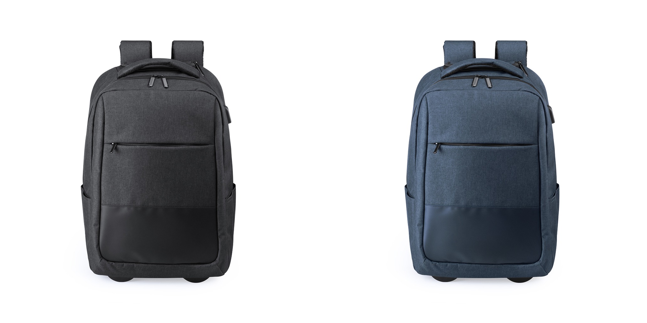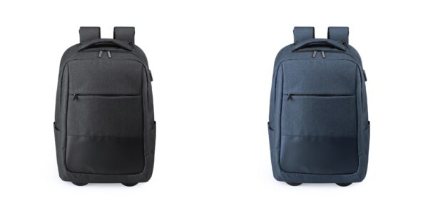 Mochila trolley em resistente poliéster 300D. Com conexão USB – powerbank não incluído – e bolso acolchoado interno para portátil de até 15 polegadas, compartimento para tablet de até 10 polegadas. Bolso principal com fecho duplo, bolsos laterais e frontais. Compartimento com fecho para mecanismo de trolley, alça reforçada e acessório cobre-rodas com fixação de velcro. Acolchoado traseiro e alças ajustáveis ??acolchoadas.