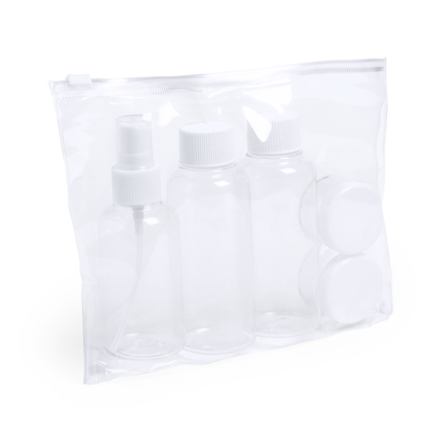 Necesire de viagem com 5 acessórios de design transparente. Inclui duas garrafas para gel e champõ com tampa de rosca, vaporizador e 2 caixas para creme. Apresentado num estojo de PVC com fecho hermético.