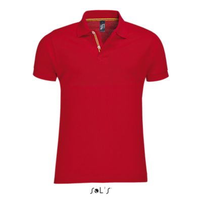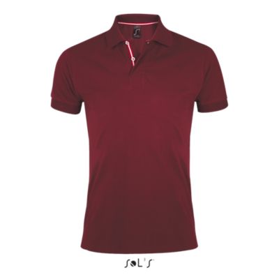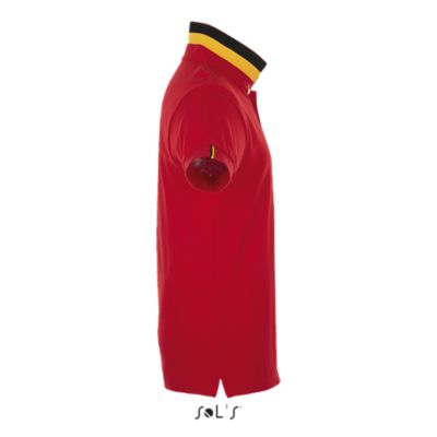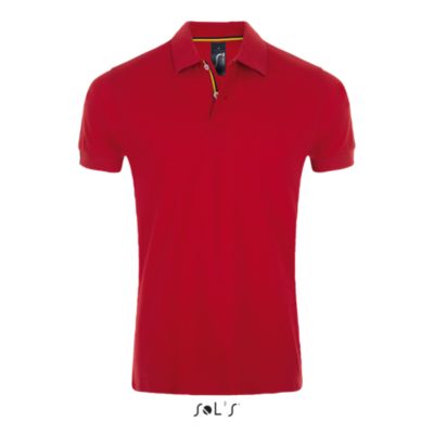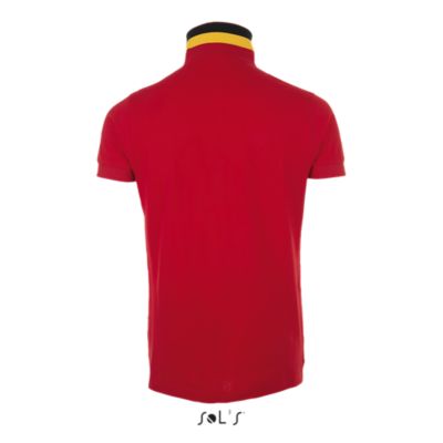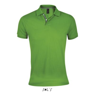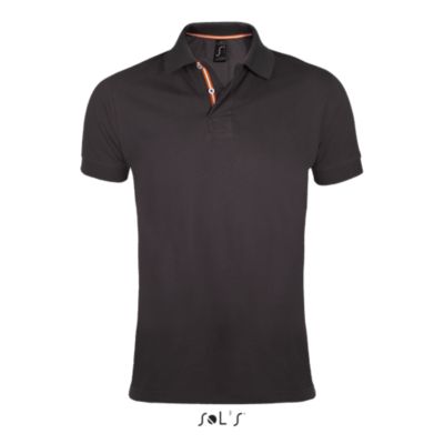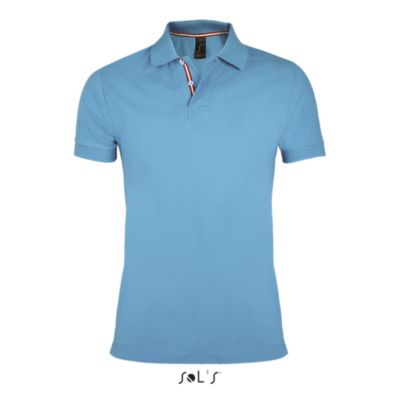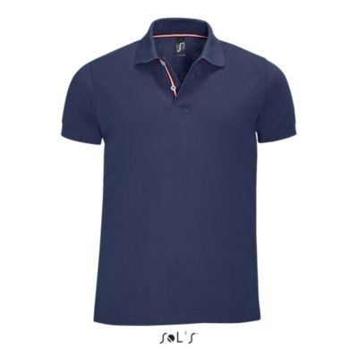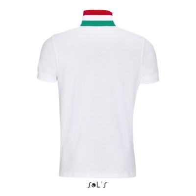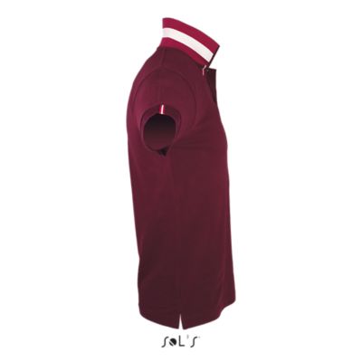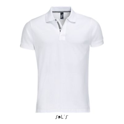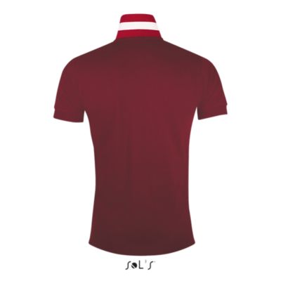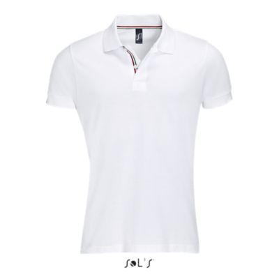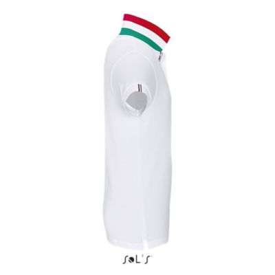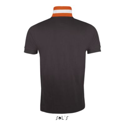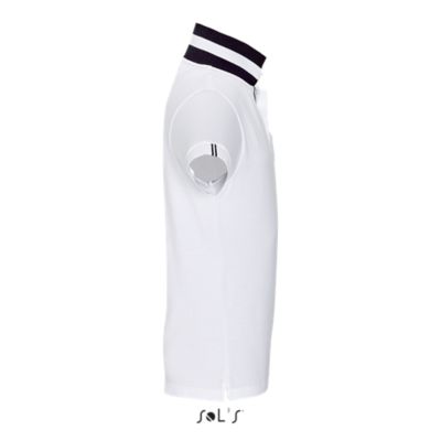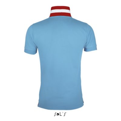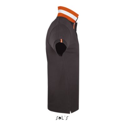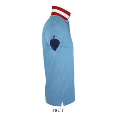 Interior da gola, carcela, aberturas laterais e acabamento da manga com tira às riscas em sarja