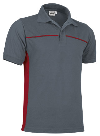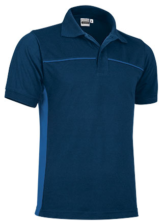50% poliéster, 50% algodão. Malha pique 210 grs/m2. Gola e cós das mangas tricô. Dupla costura em mangas e pala. Carcela 2 botões na mesma côr. Tira no peito com vivo. Bandas laterais. Aberturas laterais em baixo.