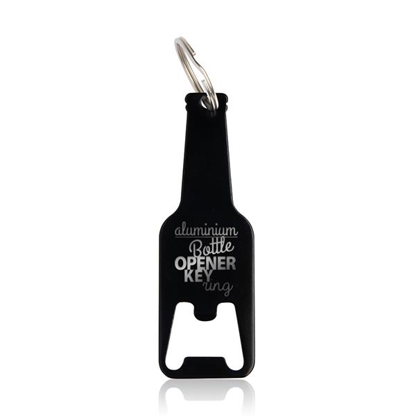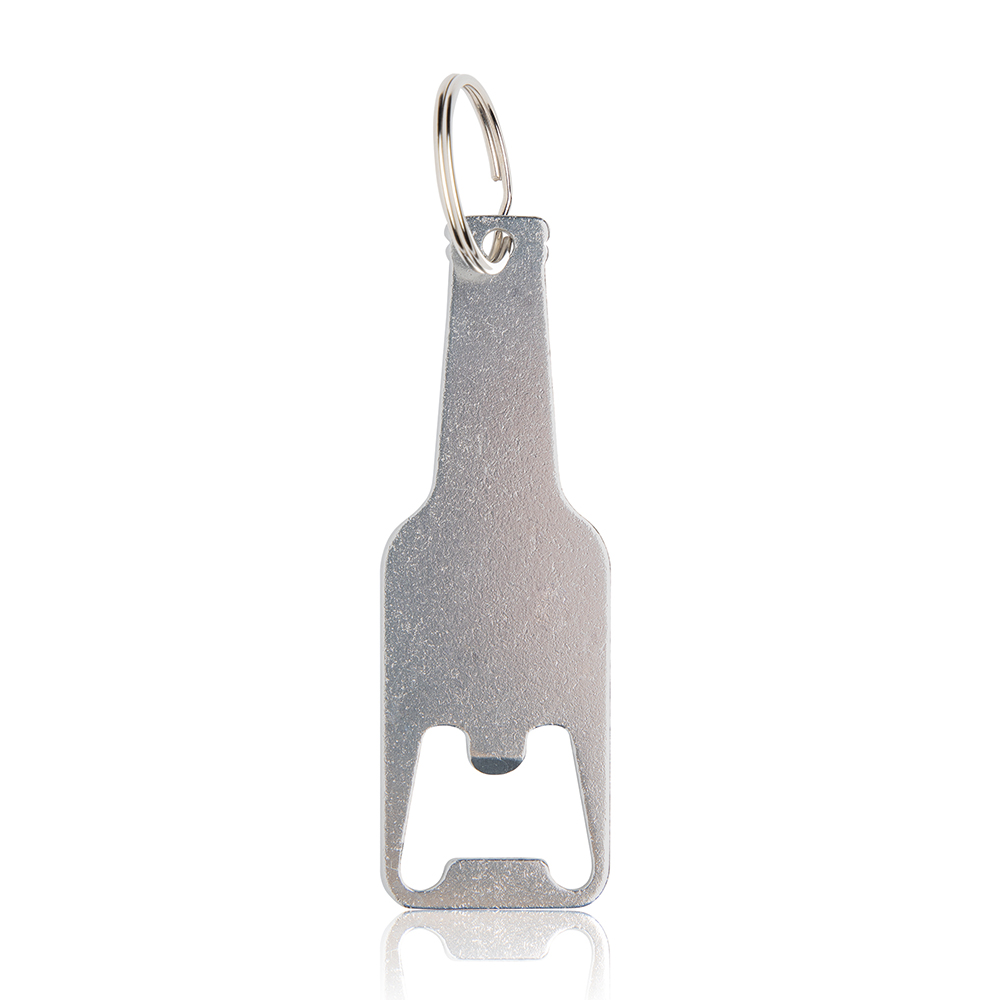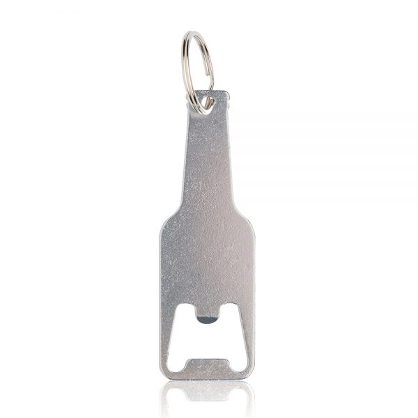 Porta-chaves Salik em alumínio com formato de garrafa com abre-cápsulas. Com este porta-chaves anda sempre prevenido. Personalizável a tampografia e a Laser Fibra.