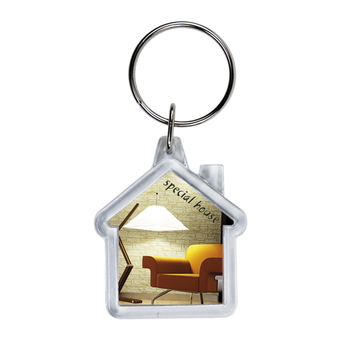 Porta-chaves em acrílico com formato de casa. Com 2 faces para inserção de papel