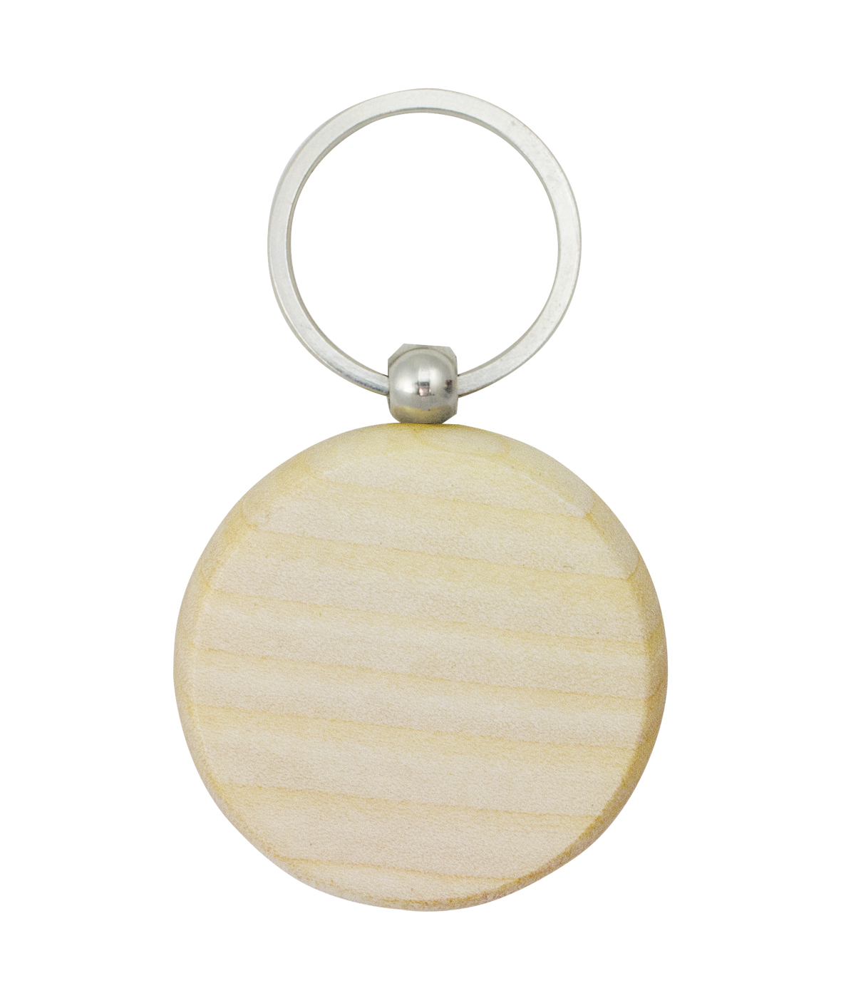 Porta-chaves redondo em madeira. Numa onda natural e ecológica, este porta chaves de madeira tem ótima área de gravação. Inclui ainda uma argola metálica.