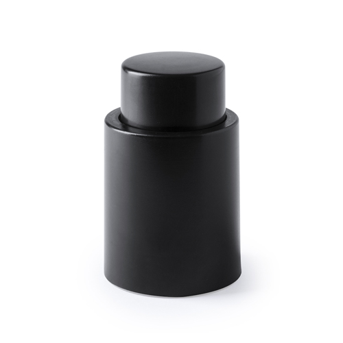 Rolha com bomba de vácuo para garrafas de vinho em elegante design preto. Topo da rolha para marcação em tampografia. Apresentado em caixa individual.