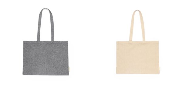 Com fole e disponível nas cores natural e preto, com distintivo algodão reciclado na etiqueta exterior.