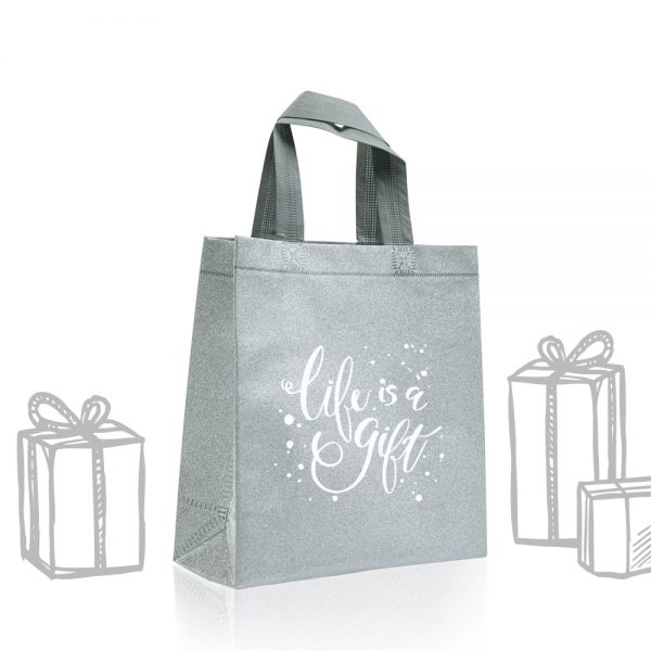 Saco prenda em TNT glitter 130g, Alças em TNT simples.Um presente necessita sempre de um embrulho à altura. Nada melhor que este saco glitter, para fazer brilhar ainda mais a sua marca.
