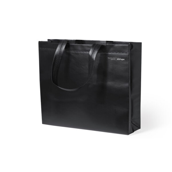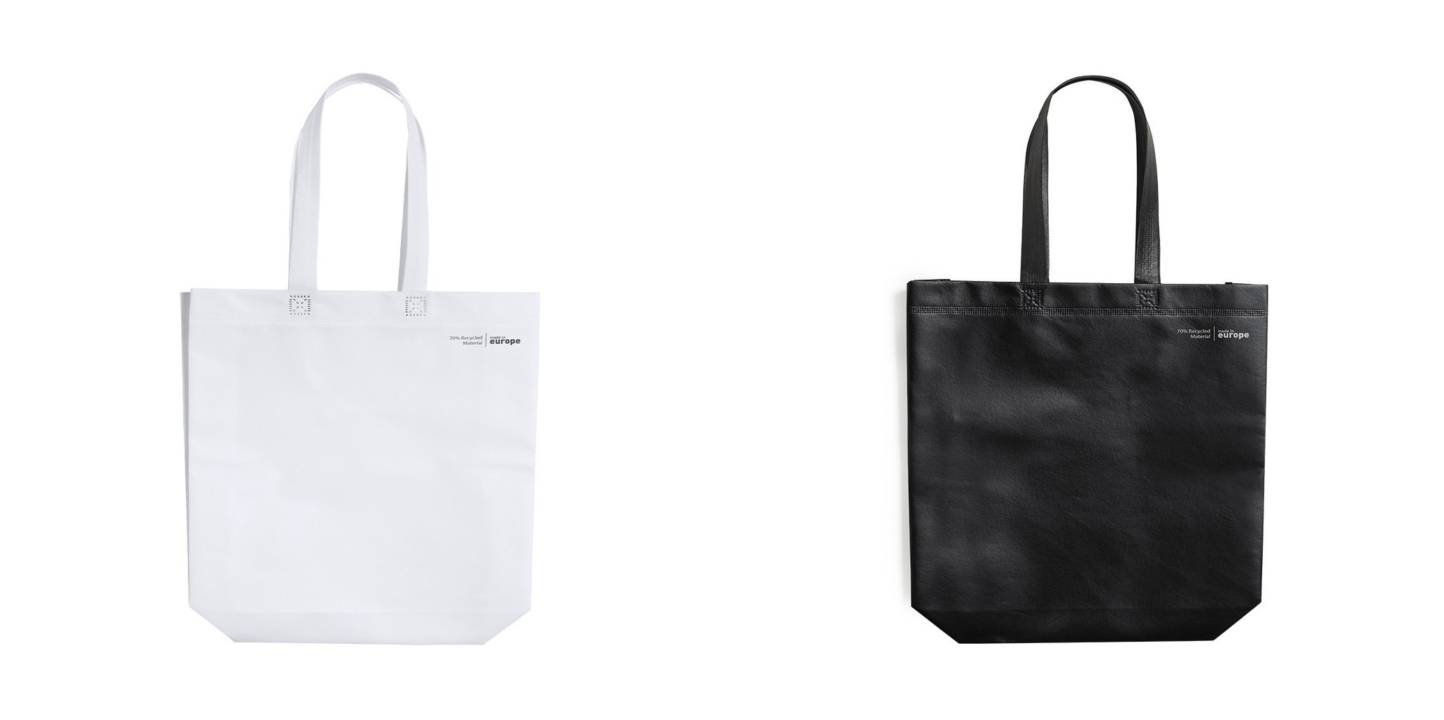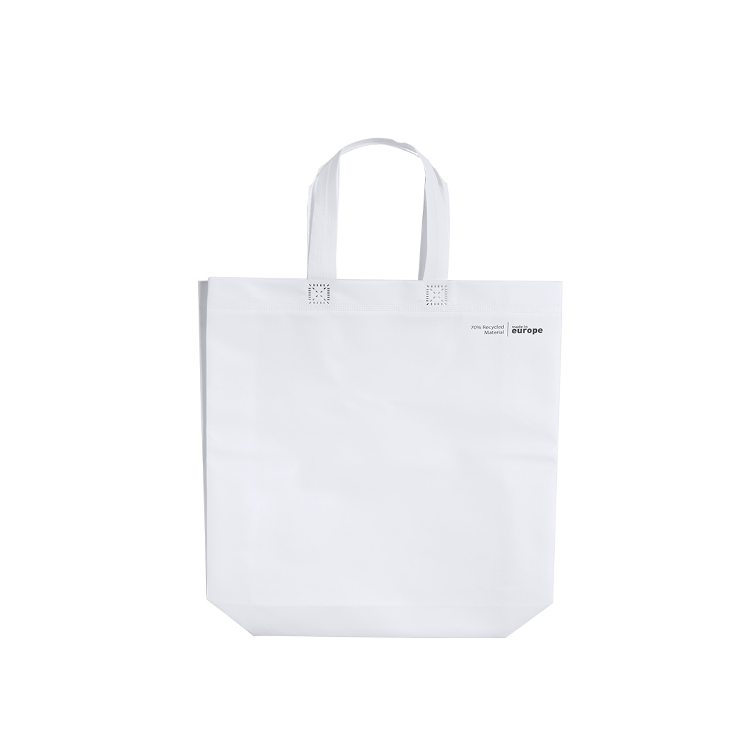 Saco da linha nature, fabricado em non-woven laminado reciclado de 120g/m2. De fabricação europeia, com acabamento termoselado, fole, alças compridas e distintivo eco/made in no saco