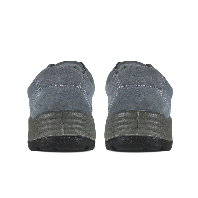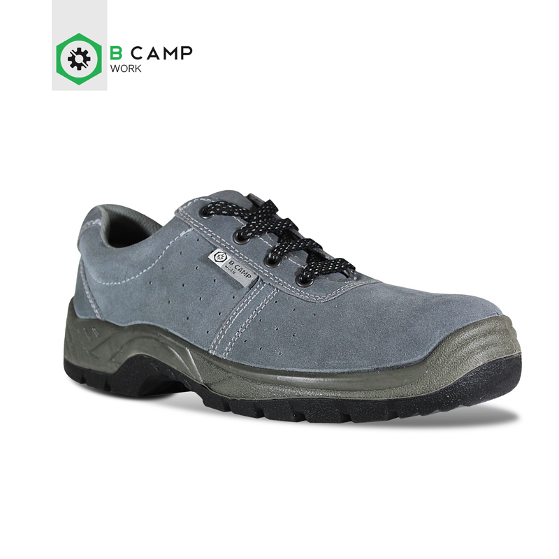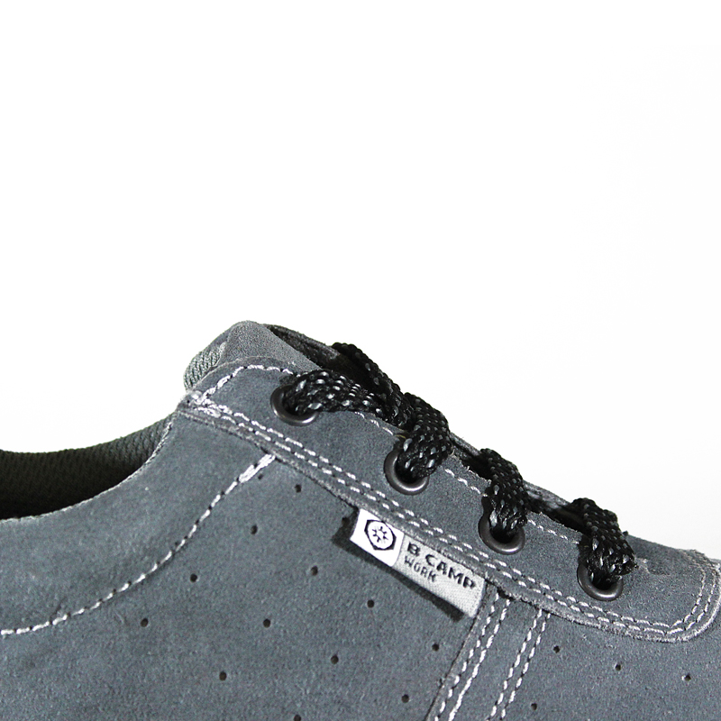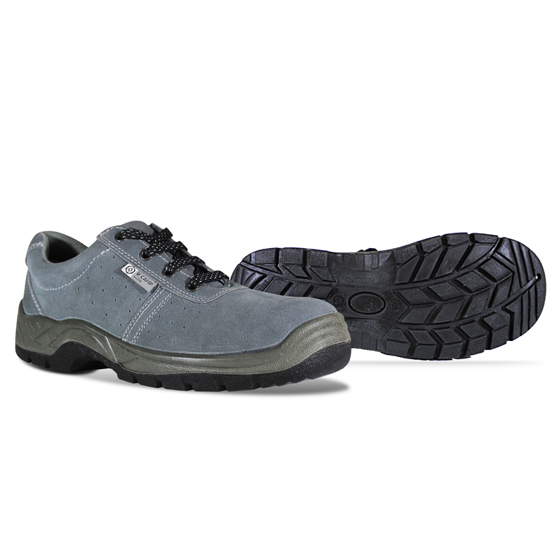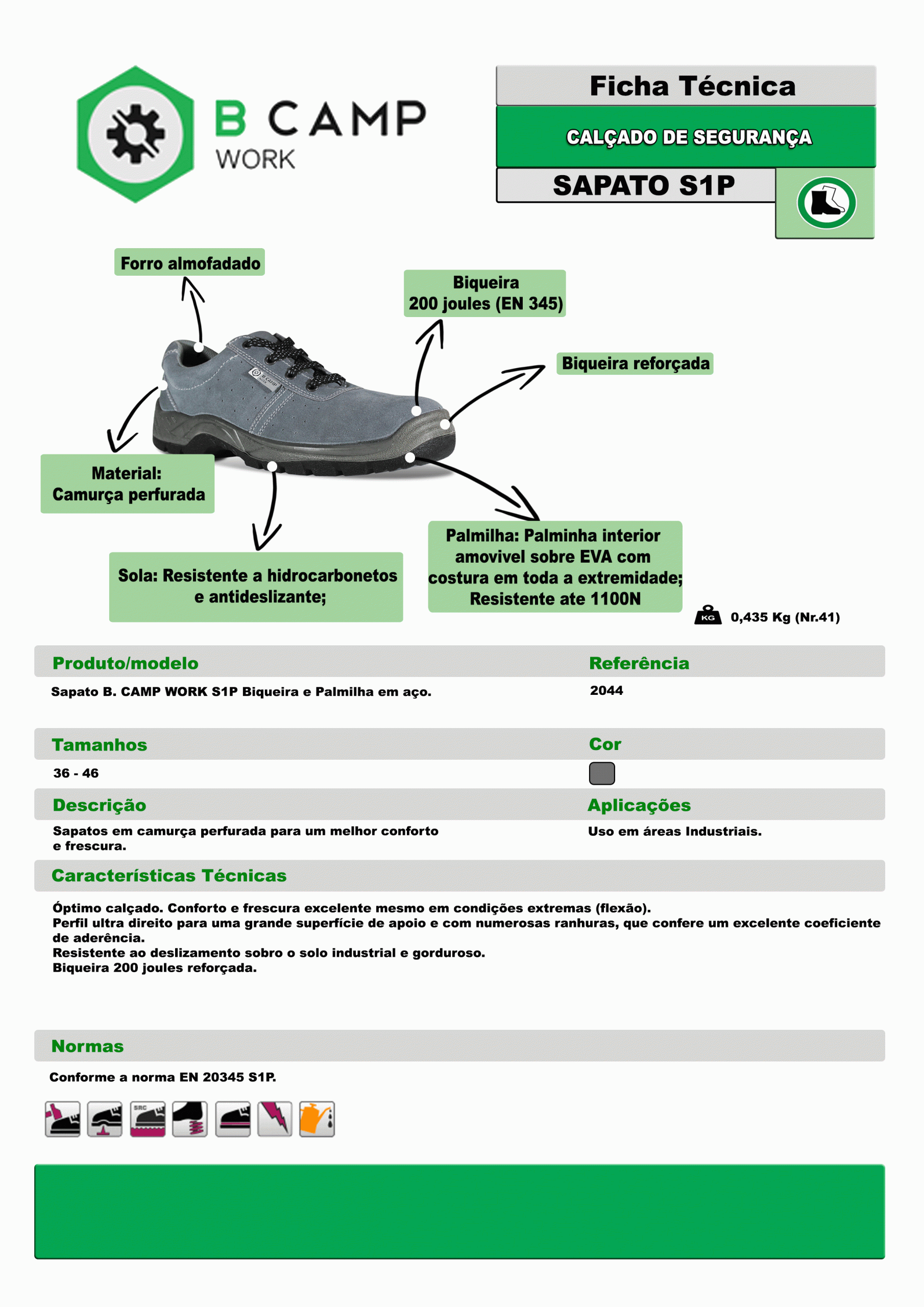 Sapato S1P em camurça perfurado; Biqueira de aço; Palmilha de aço; Sola resistente a fogo e óleo; Resistência a ácidos; Anti-estático e anti-derrapante; Tacão resistente ao choque