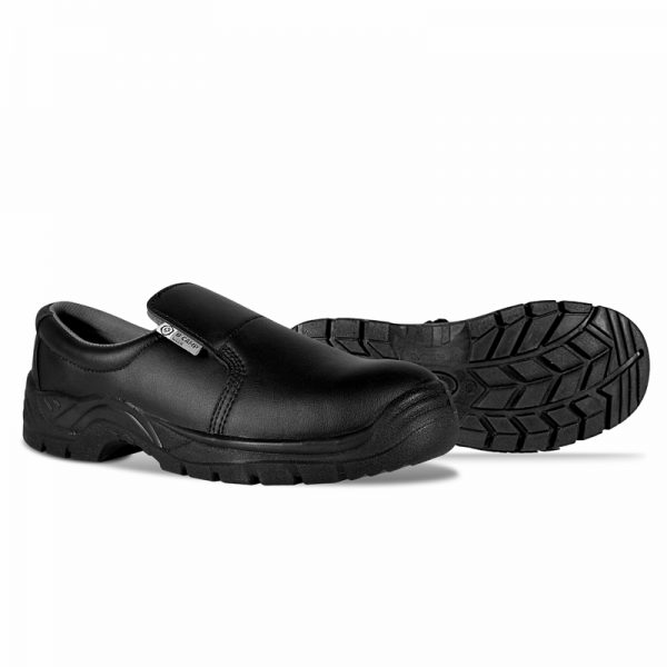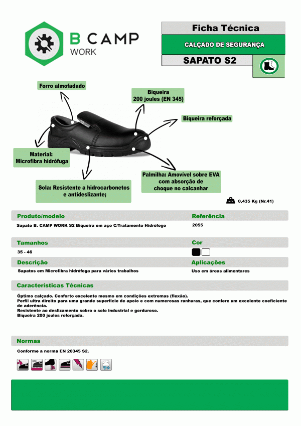 Sapato S2 para áreas alimentares; Biqueira de aço; Resistencia á água; Sola resistente ao fogo e óleo; Resistência a ácidos; Anti-estático e anti-derrapante; Tacão resistente ao choque