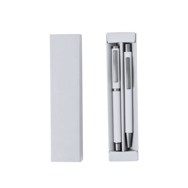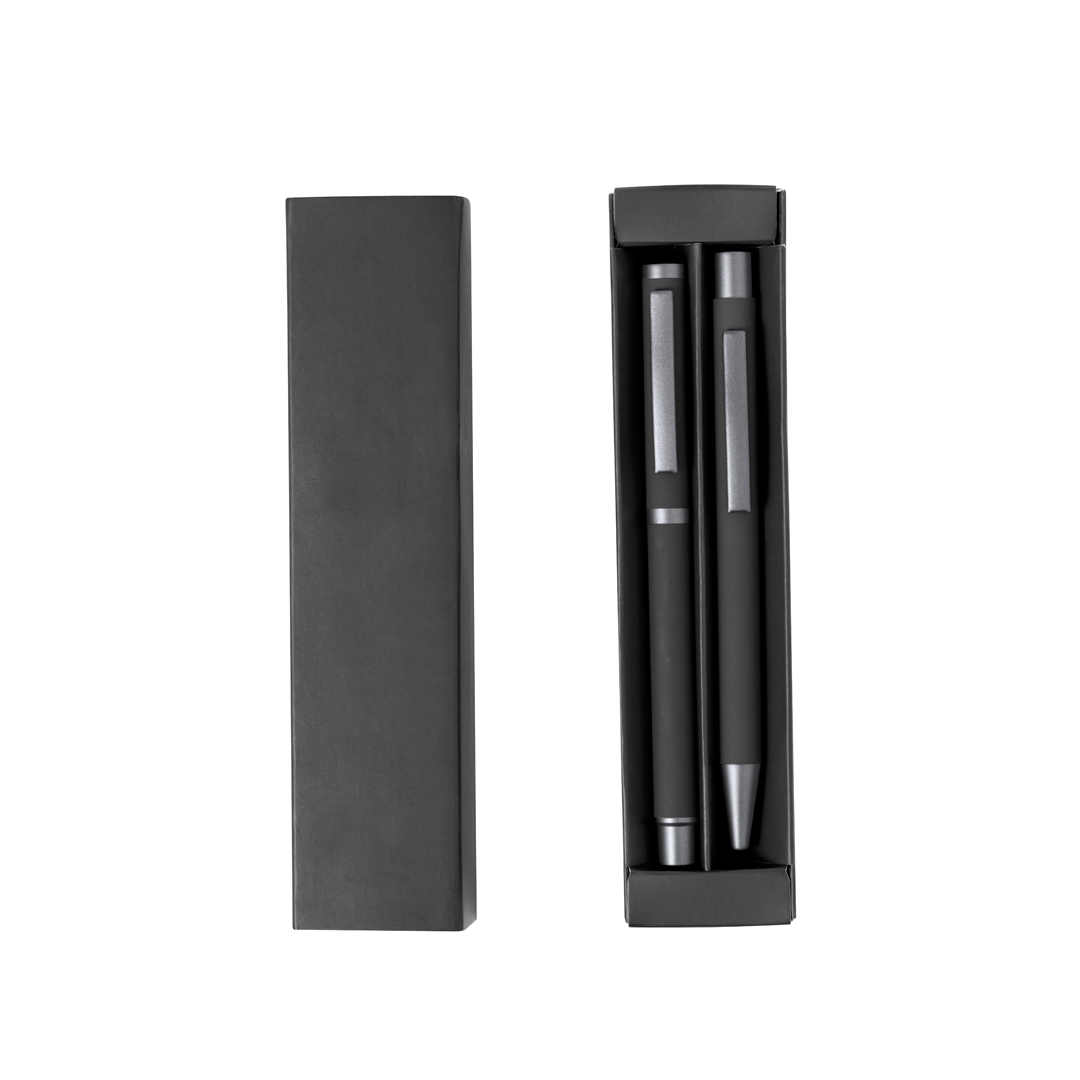 Elegante set de esferográfica e roller. Esferográfica com mecanismo pulsador e roller com tampa, ambos com clip metálico, carga jumbo e tinta azul. Corpo em variadas cores sólidas com acabamento aborrachado e detalhes metálicos em cinzento escuro. Apresentado numa caixa de variadas cores a condizer com compartimentos interiores separados.