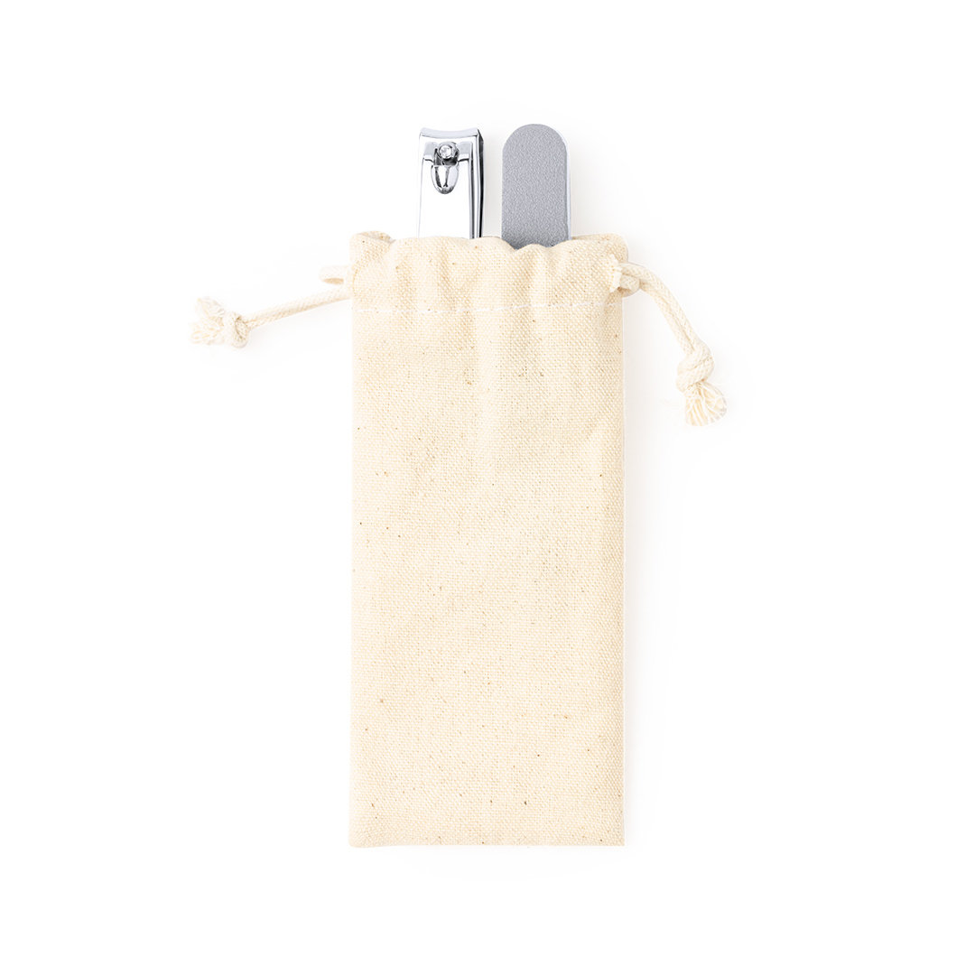 Conjunto de manicure com corta-unhas e lima. Apresentado numa bolsinha individual com fecho de cordões em algodão cru.