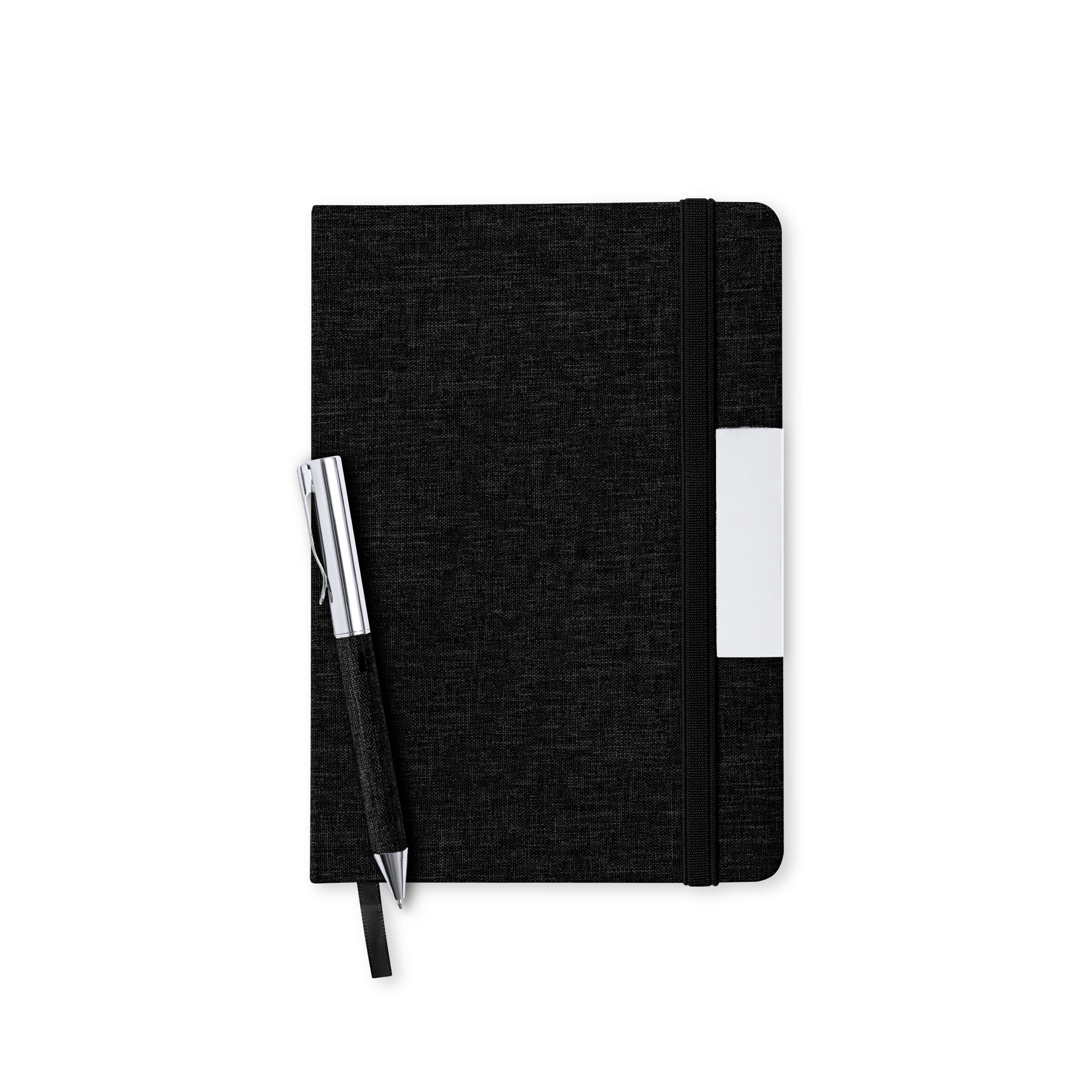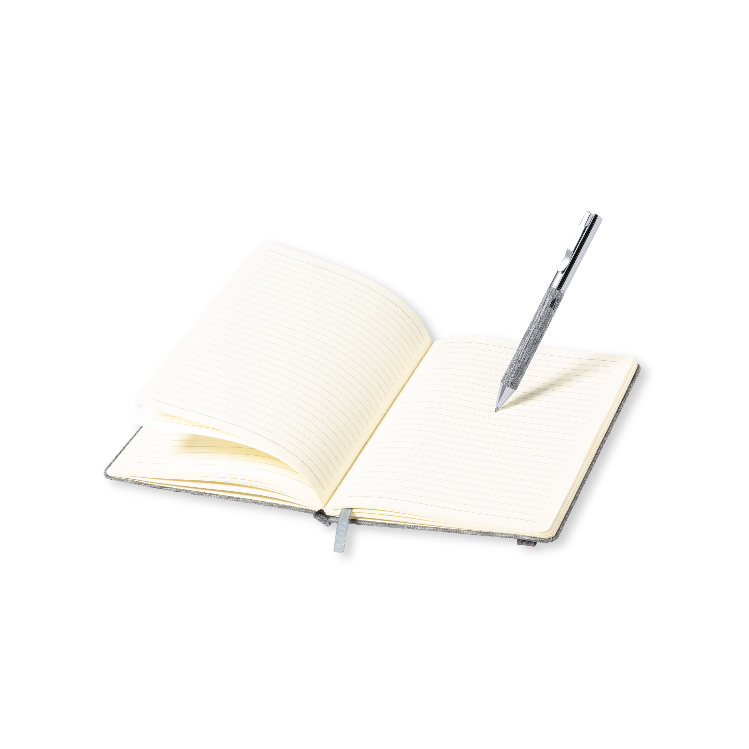 Bloco de notas de capas rígidas, com detalhe metálico na capa, marca páginas de tecido e fita elástica a condizer. 100 folhas interiores com disposição pautada e distintivo RPET.