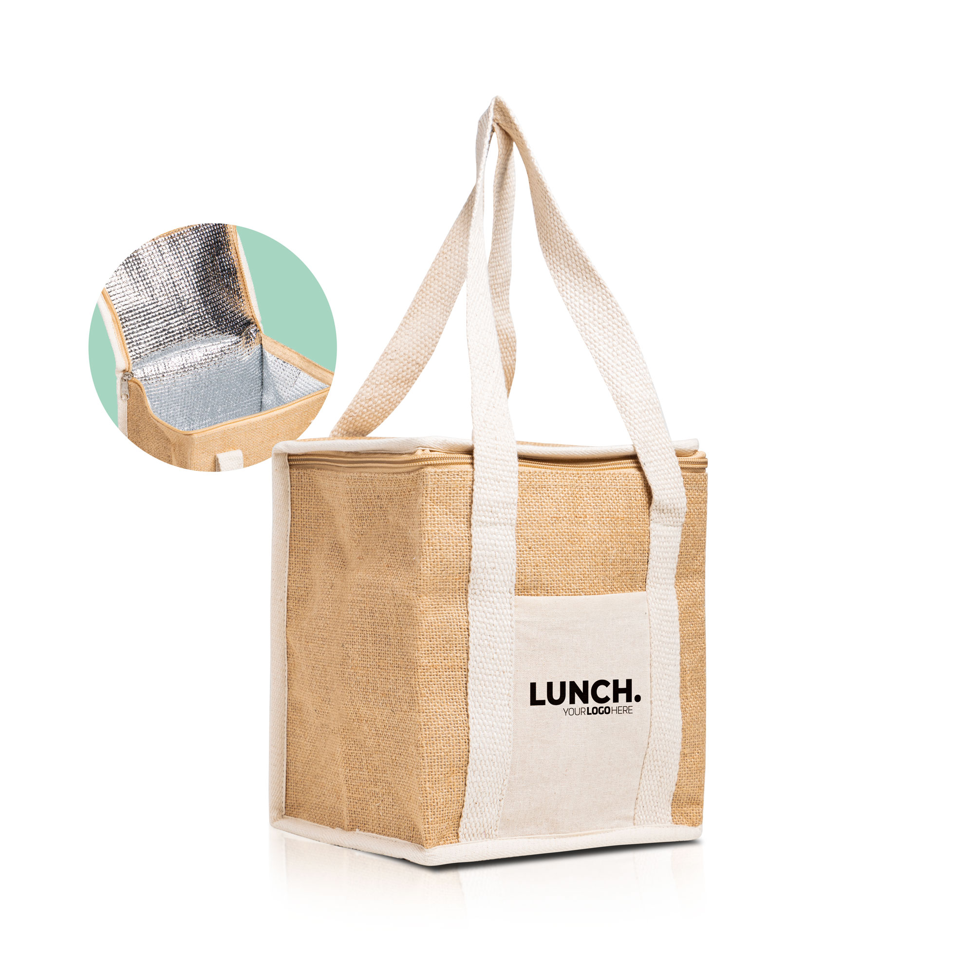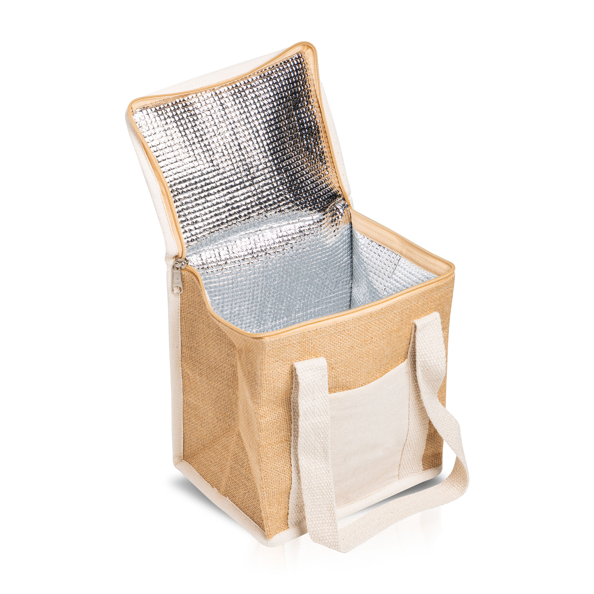 Saco térmico em juta. Esta geleira feita em materiais naturais conta com um bolso exterior em algodão para facilitar a impressão. Interior em alumínio com 2 mm de isolamento.
