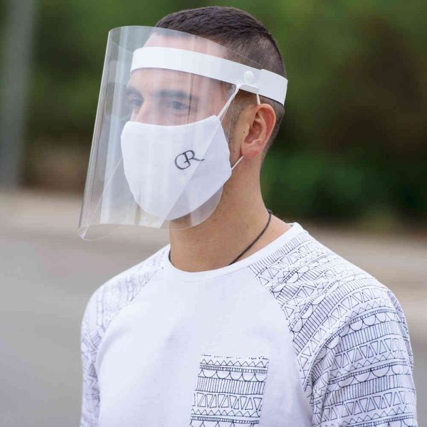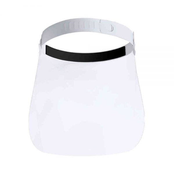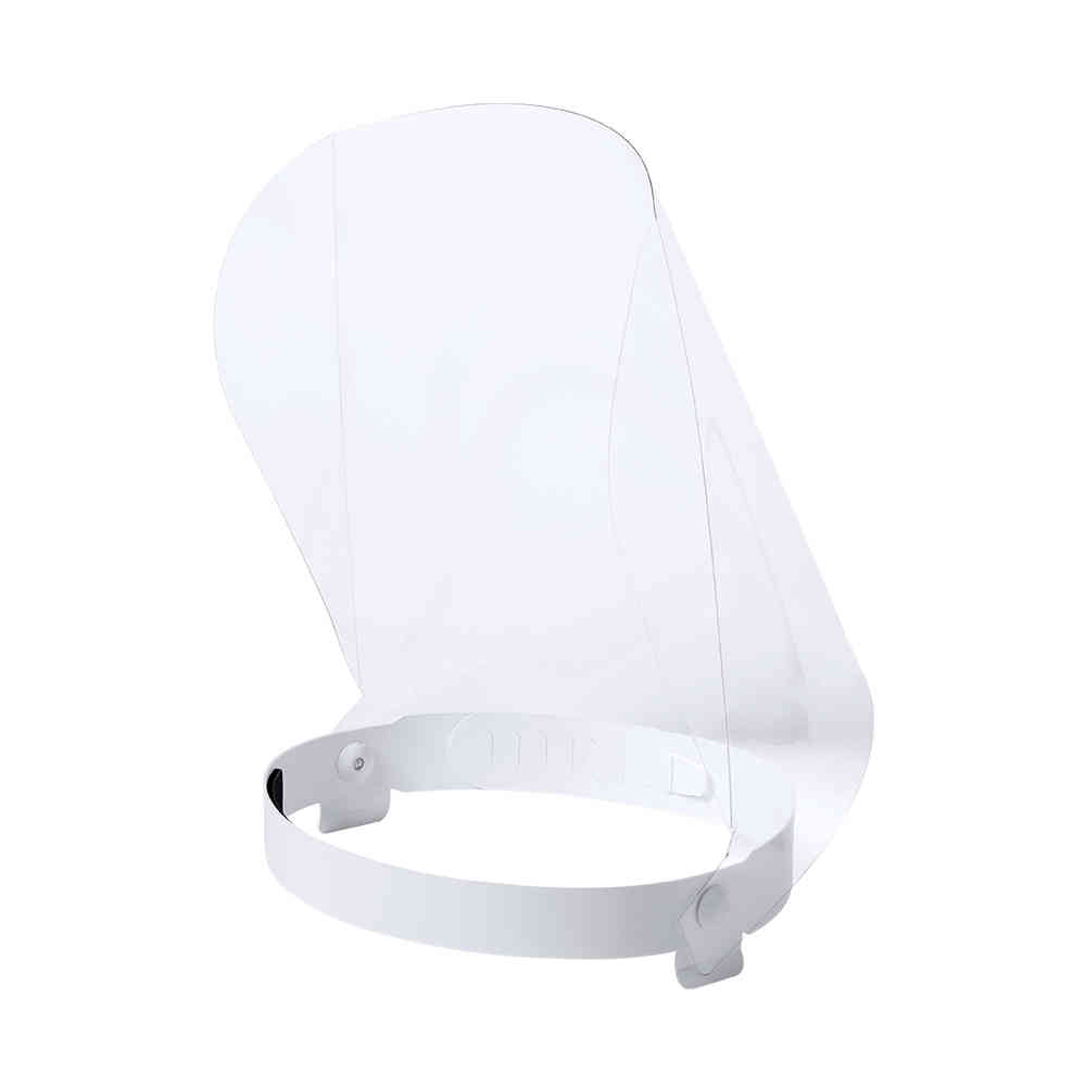 Proteção facial articulada em PET resistente. Com fita ajustável para a cabeça em PP e almofada de proteção para um ajuste confortável na testa. Fácil de desinfectar após cada utilização, com suportes laterais para as bandas elásticas da máscara. Para além de um amplo campo de visão, proporciona isolamento de salpicos e partículas em áreas particularmente sensíveis, como a zona dos olhos, nariz e boca.